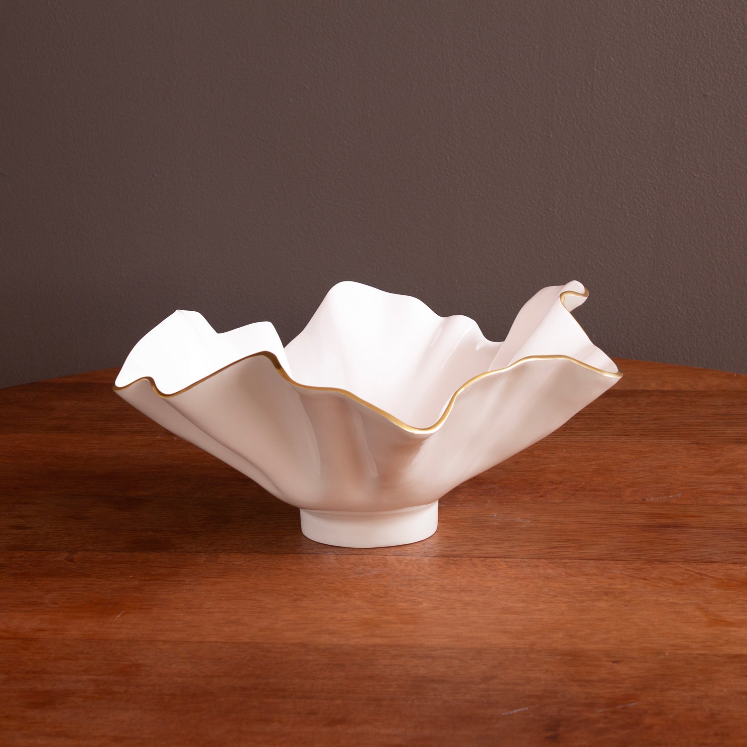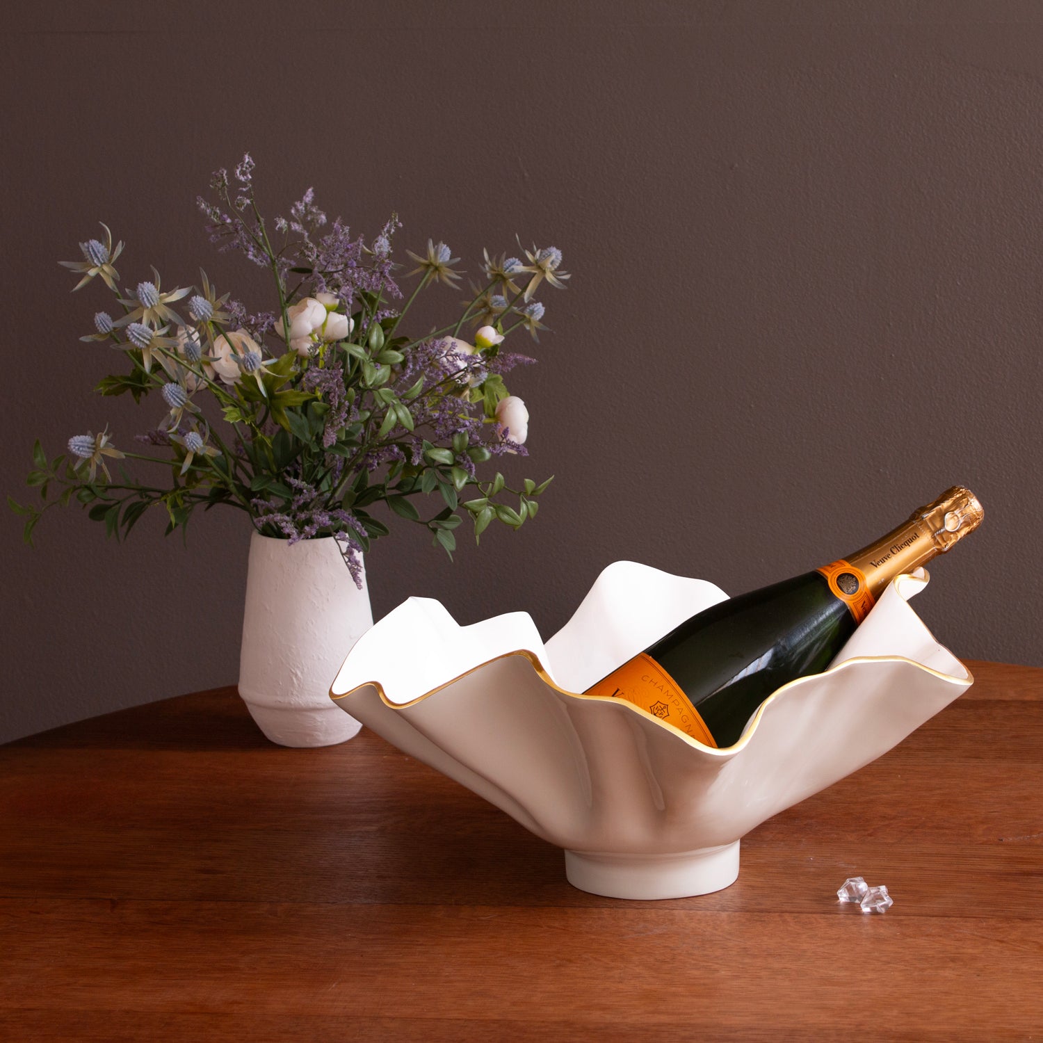The Bloom Collection is a collaboration between Beatriz Ball and Louisiana-based ceramicist Gretchen Murchison. Inspired by floral and botanical forms, the result is a vibrant line of pieces that are beautiful as well as functional. Now enhanced with color and a shimmering gold rim, the dynamic design of the ENCANTO Bloom Wine Bucket (Cream and White) features rippling petal-like movement, creating an exciting ice or wine bucket that combines beauty, artistry and functionality. Makes a stellar centerpiece. ENCANTO pieces are fabulous gift items for brides, and perfect for anyone who loves to entertain or decorate. Beatriz Ball’s intensely handmade products use eco-friendly and sustainable materials and are crafted by artisans who trace a heritage of metalworking for generations. Made of a top quality, easy-care, aluminum alloy with a food safe enamel finish. Dishwasher safe.