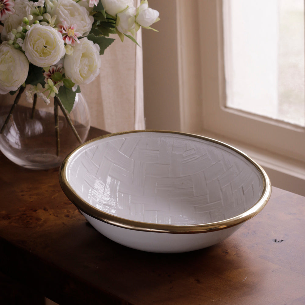 An invitation to luxury! Our THANNI Bahamas Medium Bowl (White and Gold) features a handsome basketweave texture and generous surface area of white enamel that’s trimmed in a brilliant gold tone. Beatriz Ball interprets basketweave—with a luxurious contemporary twist--in the new Bahamas selection, part of the popular THANNI Collection. This is a bowl that fits seamlessly with the brand’s handmade aesthetic, and blends perfectly with today’s trends for casual décor and entertaining. This large bowl is perfect for fresh fruit and salads. At home anywhere! Great on the kitchen island. Pair with other THANNI Bahamas pieces for a striking curated tablescape. Mix and match THANNI pieces for an interesting and functional tablescape. Each piece passionately handmade by skilled artisans in our company’s own foundry outside of Mexico City. The result is distinctively modern yet classic; where color, material and texture are used in thoughtful ways to create a collection with a distinctly sophisticated and thoroughly authentic point of view. You will not believe that the finishes are so sturdy that they can go even in commercial dishwashers. An original Beatriz Ball design, sustainably handmade of a top quality, easy-care, food safe aluminum alloy with an enamel finish. Dishwasher safe!