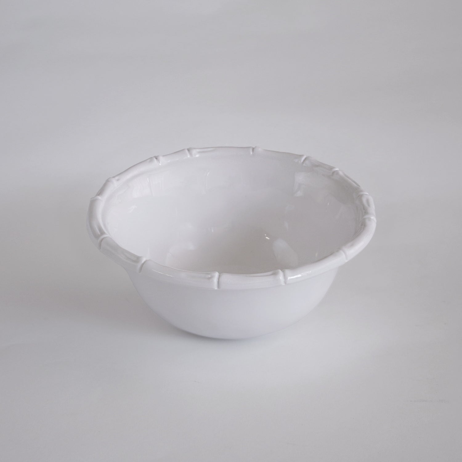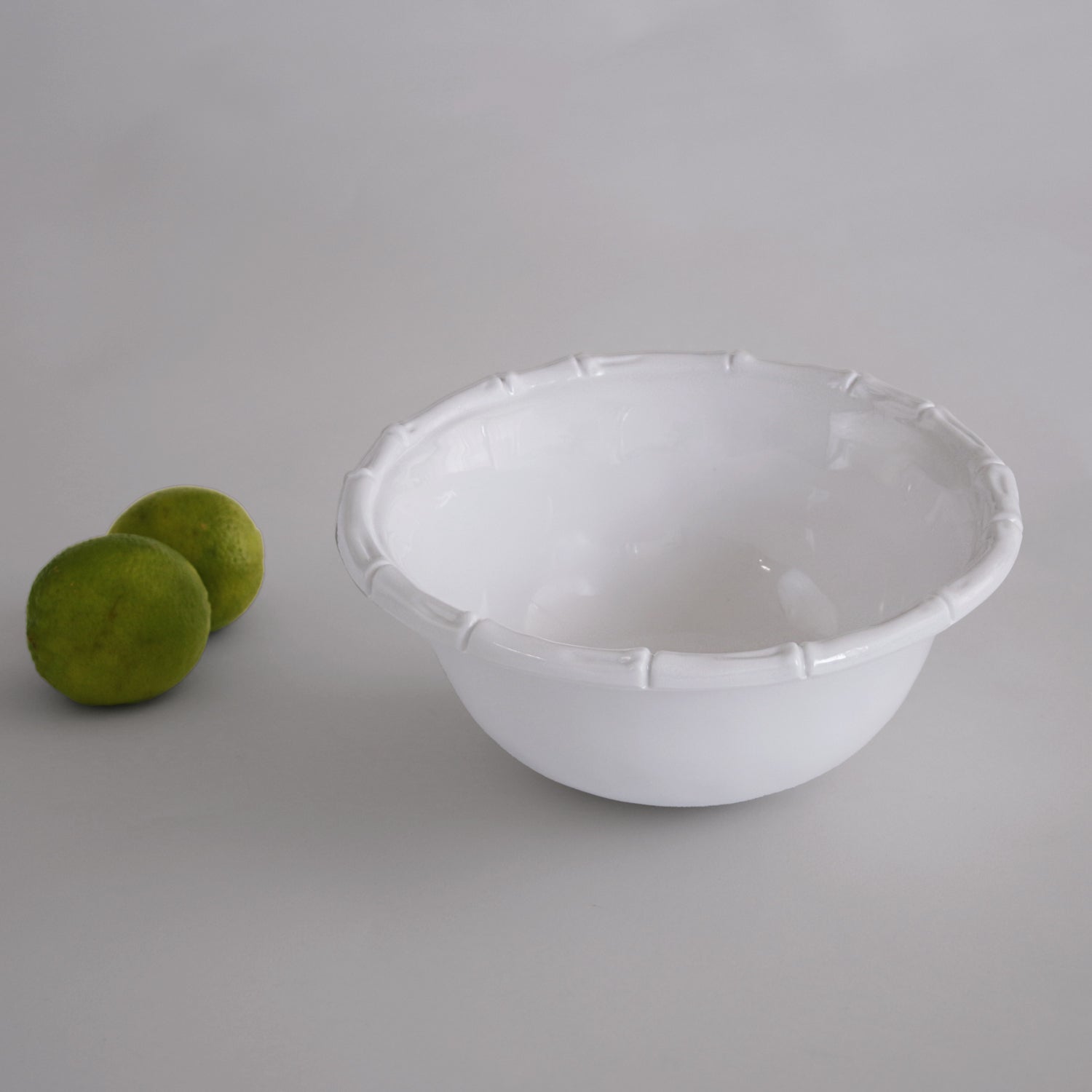 The VIDA Bamboo Cereal Bowl Set of 4 (White), is an essential item from Beatriz Ball's VIDA Collection of luxury melamine. With a bamboo inspired rim and a brilliant overall white surface, the cereal bowl may be paired with other VIDA Bamboo dining pieces for a coordinated serving set. Sold in sets of four, use them to create a table setting with a carefree, but classy, Beatriz Ball twist! It looks great when sharing a table with Bamboo items from our signature metal line. We love it with our Bamboo flatware, too. The versatile bowl has the luster, heft and look of a ceramic piece, and makes a great snack, nut or dip bowl. Made of luxury melamine for everyday enjoyment, this piece is ideally suited for indoor and outdoor entertainment. Dishwasher safe (top rack), heavy weight, food safe, BPA and PABA free.
