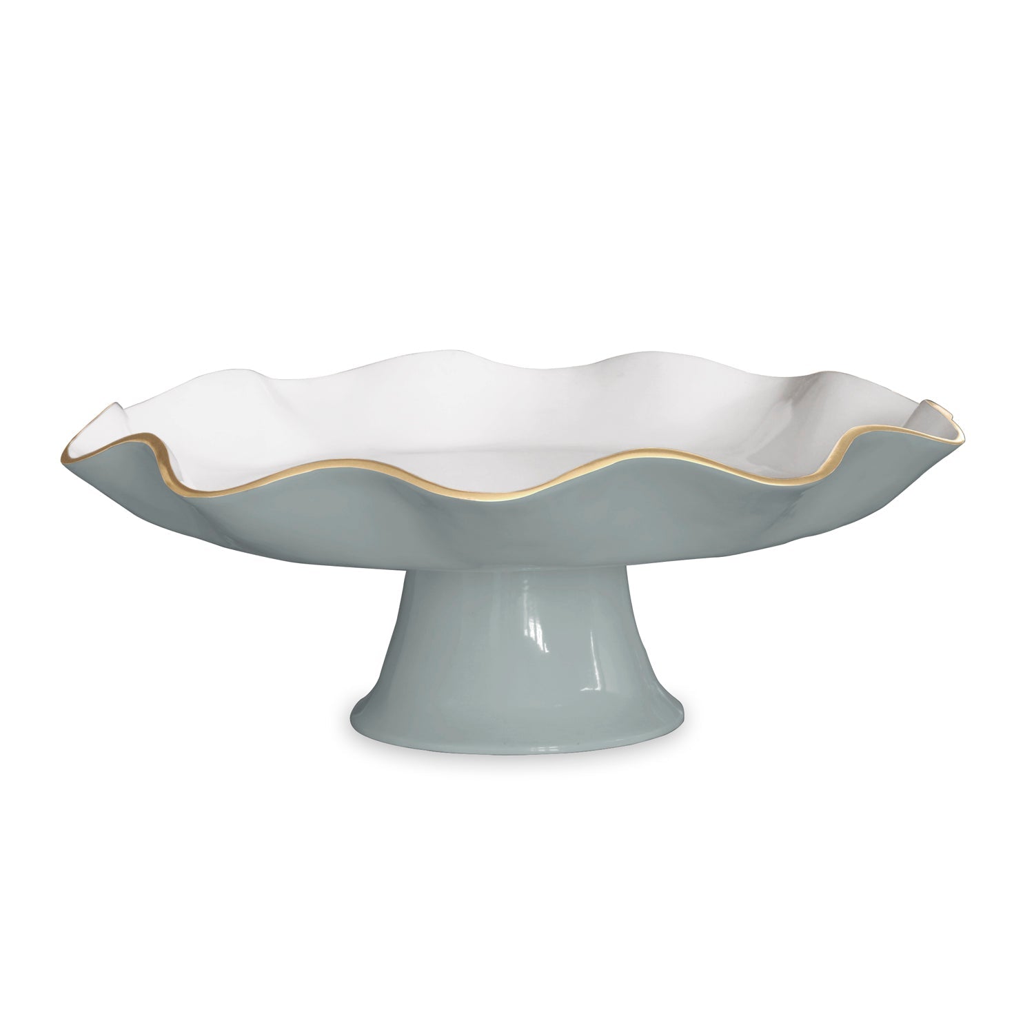 Elevate your style with the ENCANTO Carola Pedestal Cake Plate (Slate and White). With flirty curves, elegant rise, and a gleaming two-tone finish accented by gold, it makes a statement while remaining highly functional. Slate, a calm neutral blue, offers timeless versatility and a sophisticated modern edge.