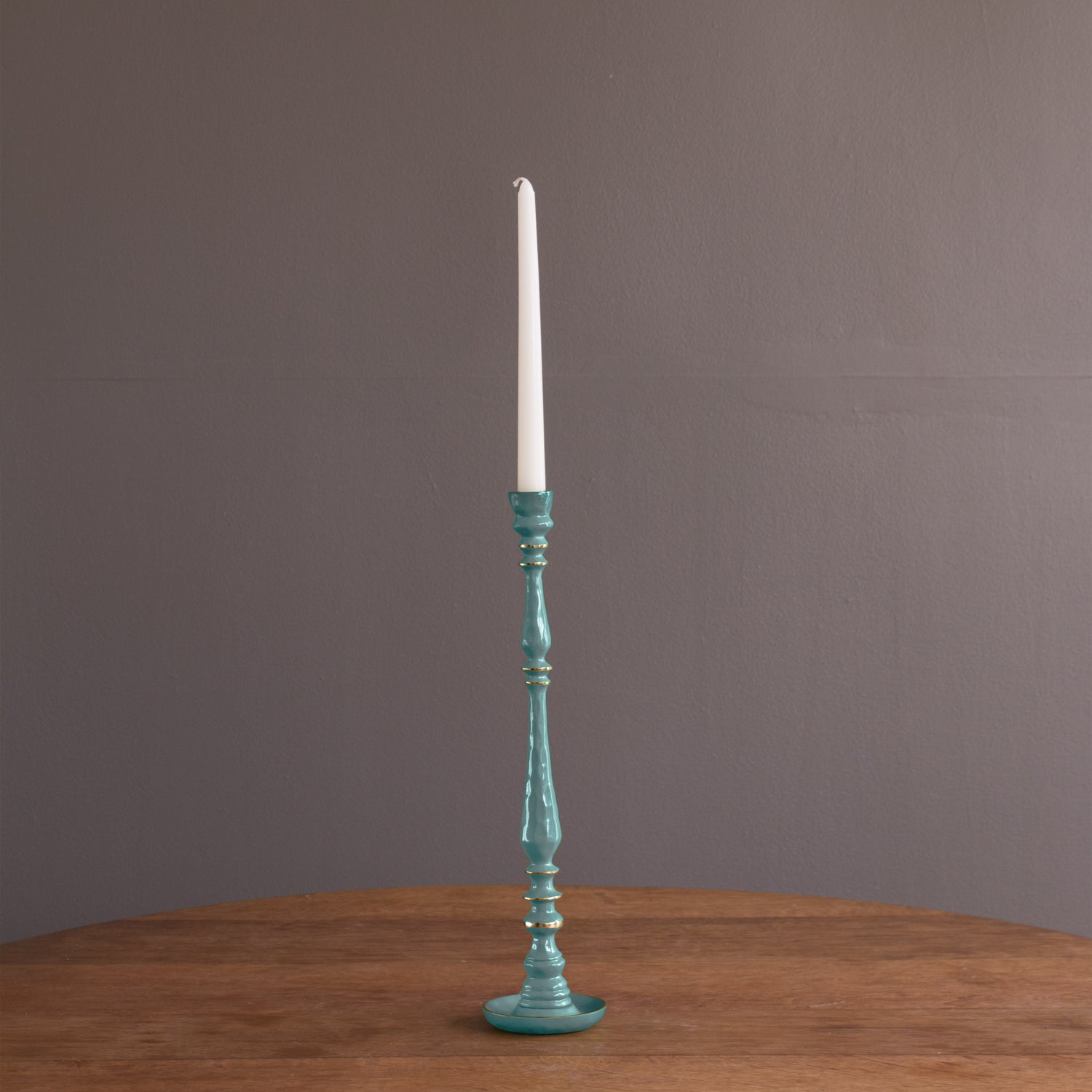 Tall and impressive, the vibrantly colored ENCANTO Crosby Candlestick Holders add a luminous touch of glamour to the home. An updated classic, the ENCANTO Crosby Medium Candlestick Holder (Turquoise) is notable for its thoughtful design, expert craftsmanship and stately proportions. Guaranteed to add a luxe look to any space, the candlestick holders can be topped with tapers in fun colors, and mixed and matched with other designs for a lively table. A great addition to the home, present them singly, in pairs, or in graduated sizes. Beatriz Ballโ€™s intensely handmade products use eco-friendly and sustainable materials and are crafted by artisans who trace a heritage of metalworking for generations. Made of a top quality, easy-care, aluminum alloy with an enamel finish. This item is for decorative purposes only and is not food safe.