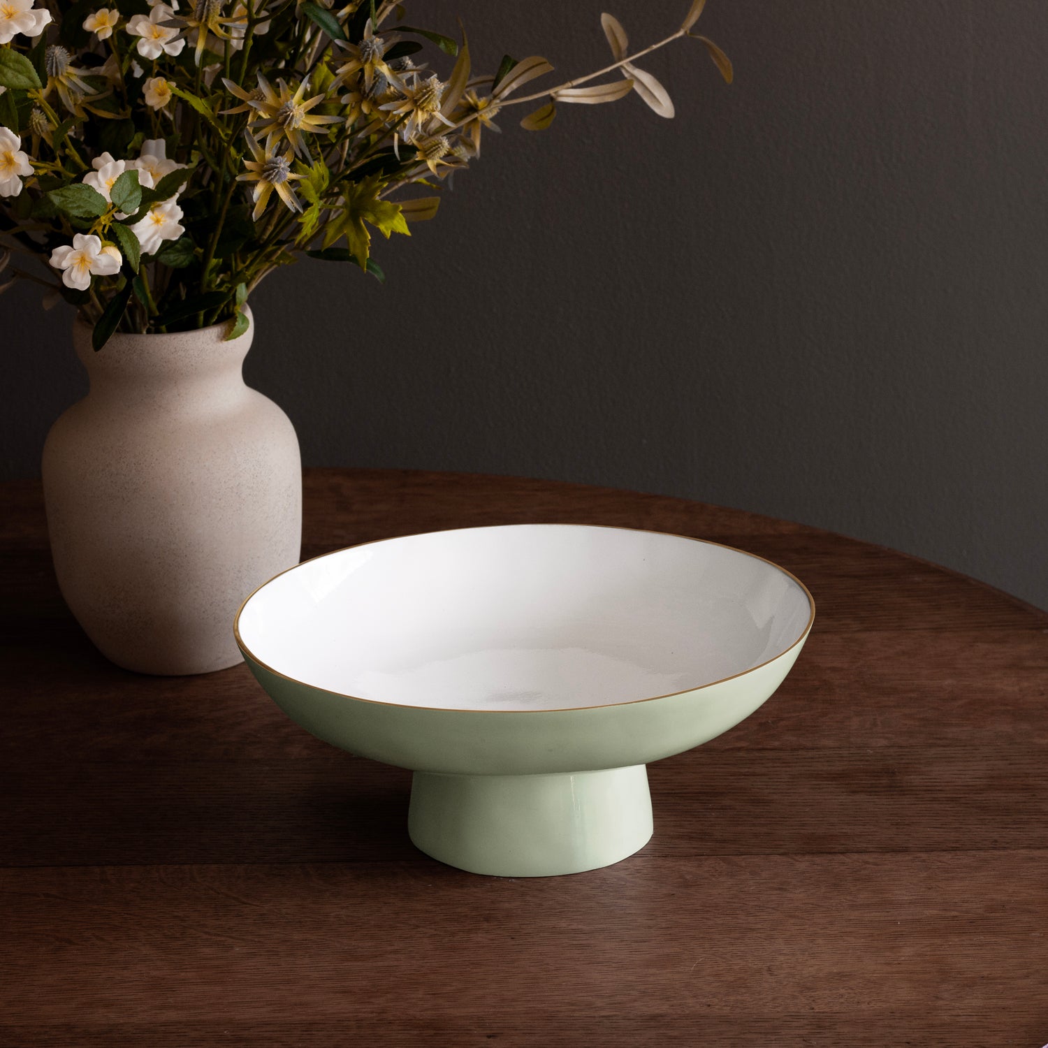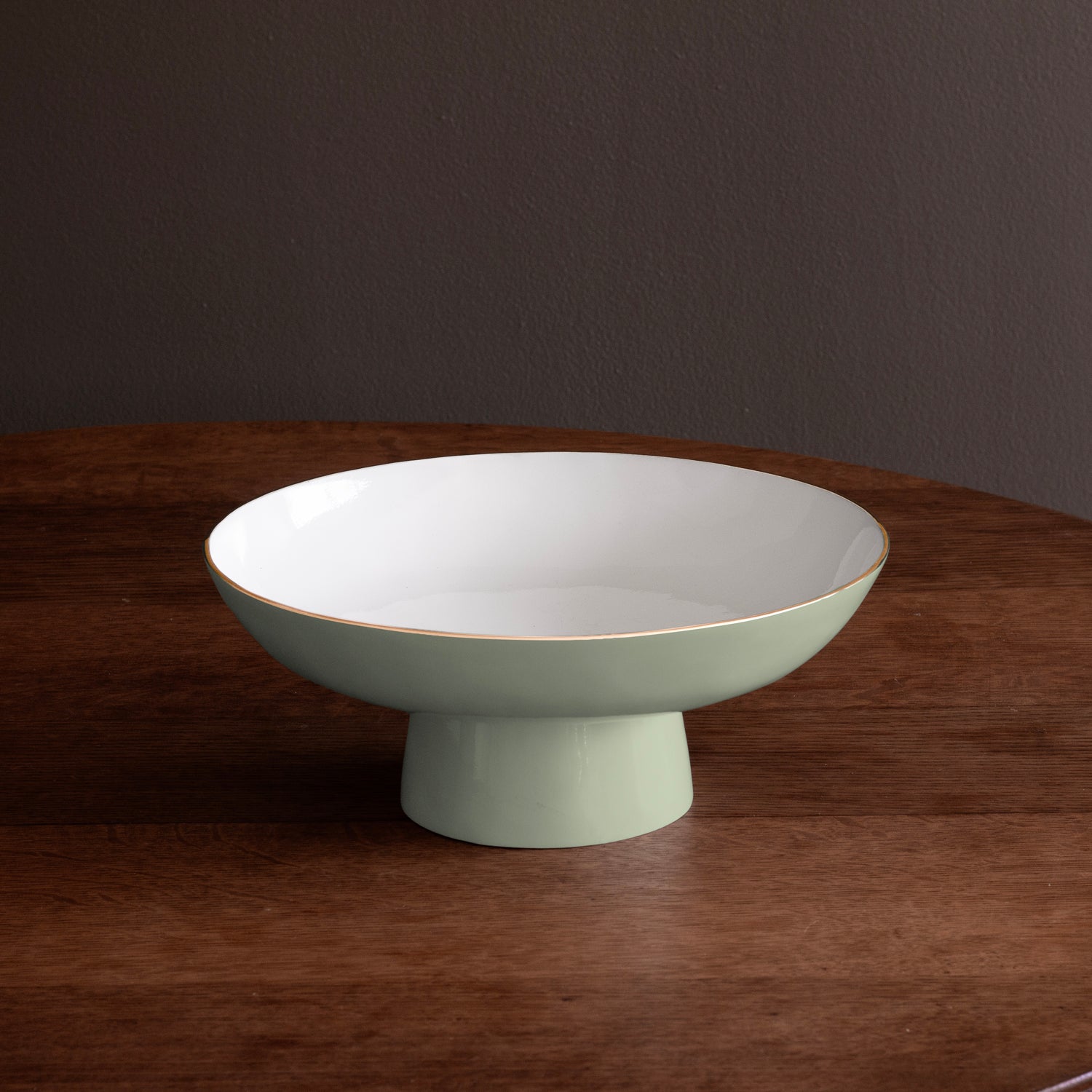 Elevated design. Notable for its clean lines, elegant shape, and brilliant two-tone finish rimmed in gold, the ENCANTO Carnaval Medium Pedestal (Pistachio and White) is a fabulous design that is as practical as it is decorative. Ideal for fruit and desserts, combine with other ENCANTO Carnaval pieces for an elevated serving set. The ENCANTO Collection pieces are all about classic shapes, re-invented in lively colors. ENCANTO items are fabulous gift items for brides, and perfect for anyone who loves to entertain and decorate. Beatriz Ball’s intensely handmade products use eco-friendly and sustainable materials and are crafted by artisans who trace a heritage of metalworking for generations. Made of a top quality, easy-care, aluminum alloy with a food safe enamel finish. Dishwasher safe.
