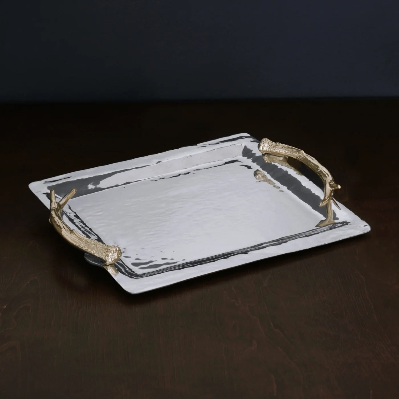 Realistic antler handles in a prorietary gold-tone finish stand out against the polished silvery tray. Designer Beatriz Ball says of the shimmering quality of the surface, "Love this cool new finish, it glimmers like moonlight on water." This glimmering, shimmering tray is designed for sharing. The Beatriz Ball WESTERN Antler Emerson Large Tray with Gold Handles boasts a generous sand-cast surface that is both spectacular and functional. Great on the table, bar or ottoman, it absolutely invites sharing. Handmade by skilled artisans, this is a multipurpose tray your guests will appreciate as much for its supreme functionality as for its artistic originality. Makes an awesome gift! An original design and Beatriz Ball exclusive! Beatriz Ball’s intensely handmade products use eco-friendly and sustainable materials and are crafted by artisans who trace a heritage of metalworking for generations. Made of a top quality, FDA safe, easy-care aluminum alloy.