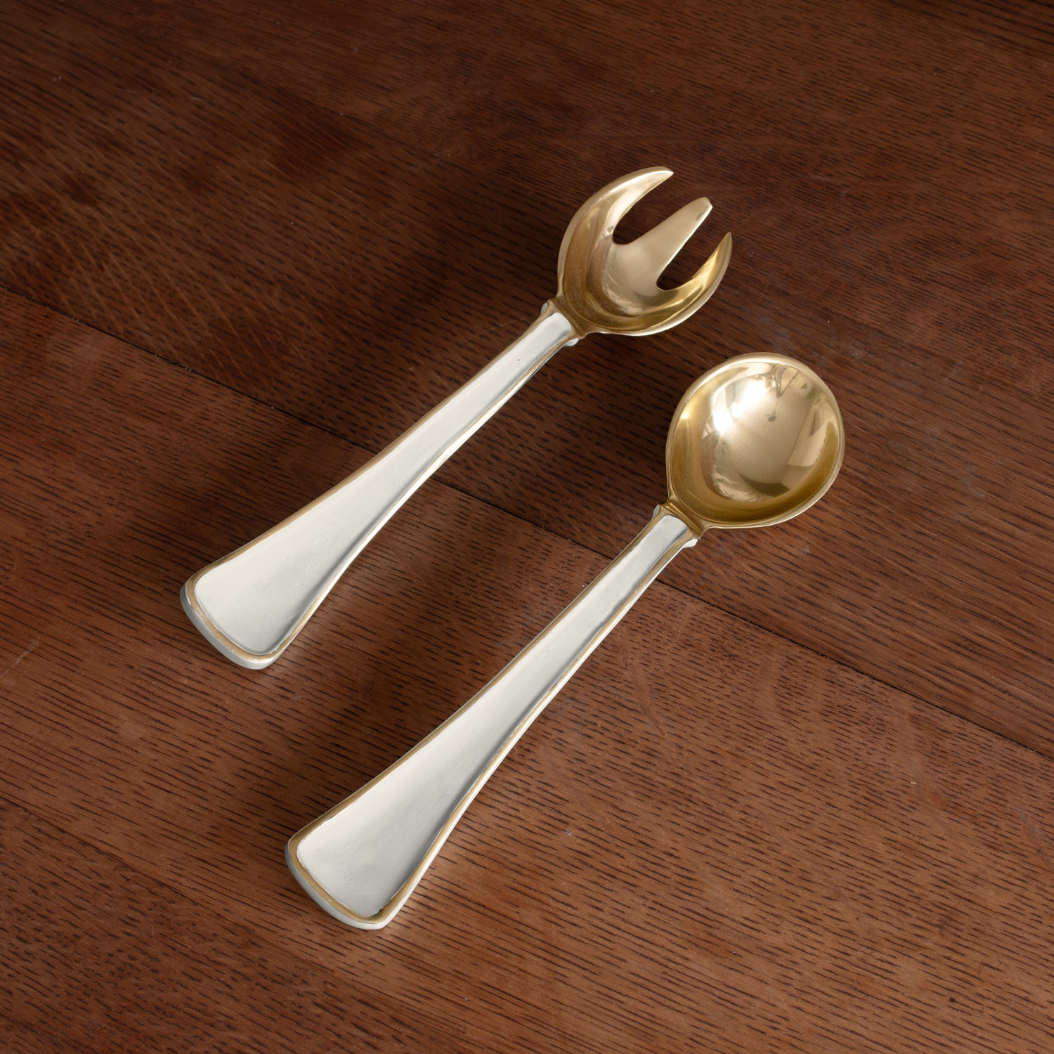 The sensational ENCANTO Soho Salad Servers (Cream) in a cream tone with gold details is a shining example. Fabulous servers to add a touch of glam to any table. Food- and dishwasher-safe, the sparkling set adds a modern new dimension to Beatriz Ball’s award-winning designs. Combine with other ENCANTO pieces for a sensational set. Fabulous gift items for brides, and perfect for anyone who loves to entertain. Beatriz Ball’s intensely handmade products use eco-friendly and sustainable materials and are crafted by artisans who trace a heritage of metalworking for generations. Made of a top quality, easy-care, aluminum alloy with a food safe enamel finish. Dishwasher safe.
