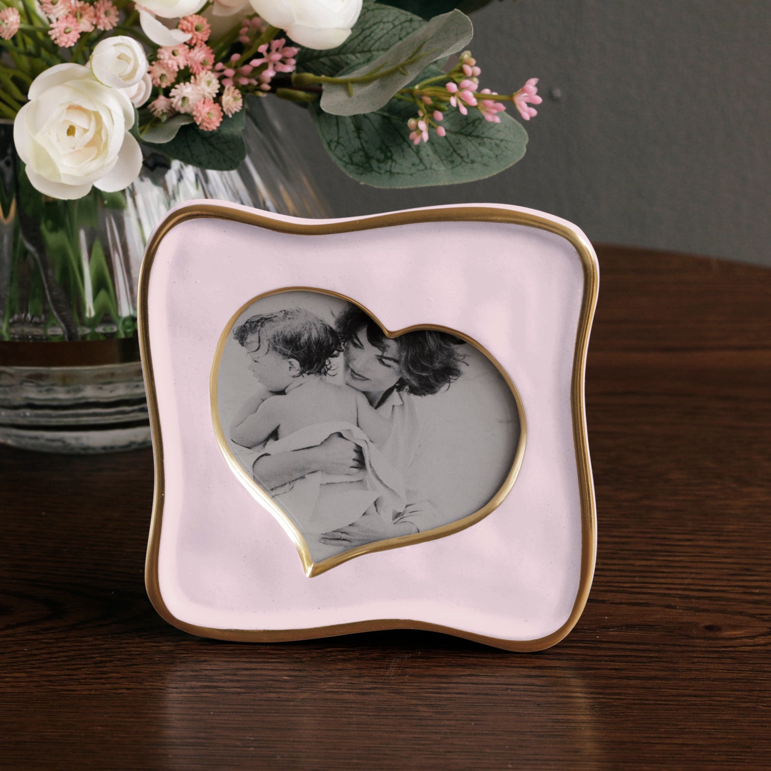 Share the love with the Encanto Curved Heart Frame 5 x 5 (Camellia), a unique and romantic design with an asymmetrical heart-shaped opening and gleaming gold rim. Handcrafted in enameled metal, this expressive 5x5 frame is both whimsical and elegant. The Camellia shade, a soft blush pink, adds warmth and charm to any interior.