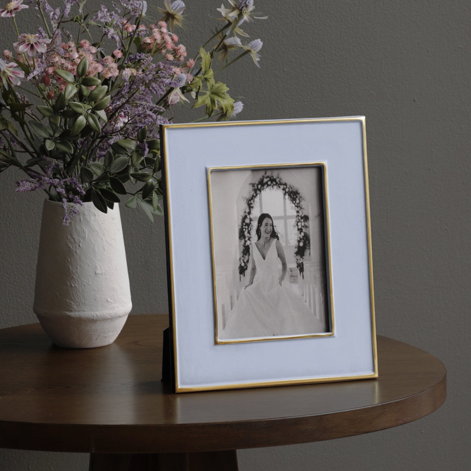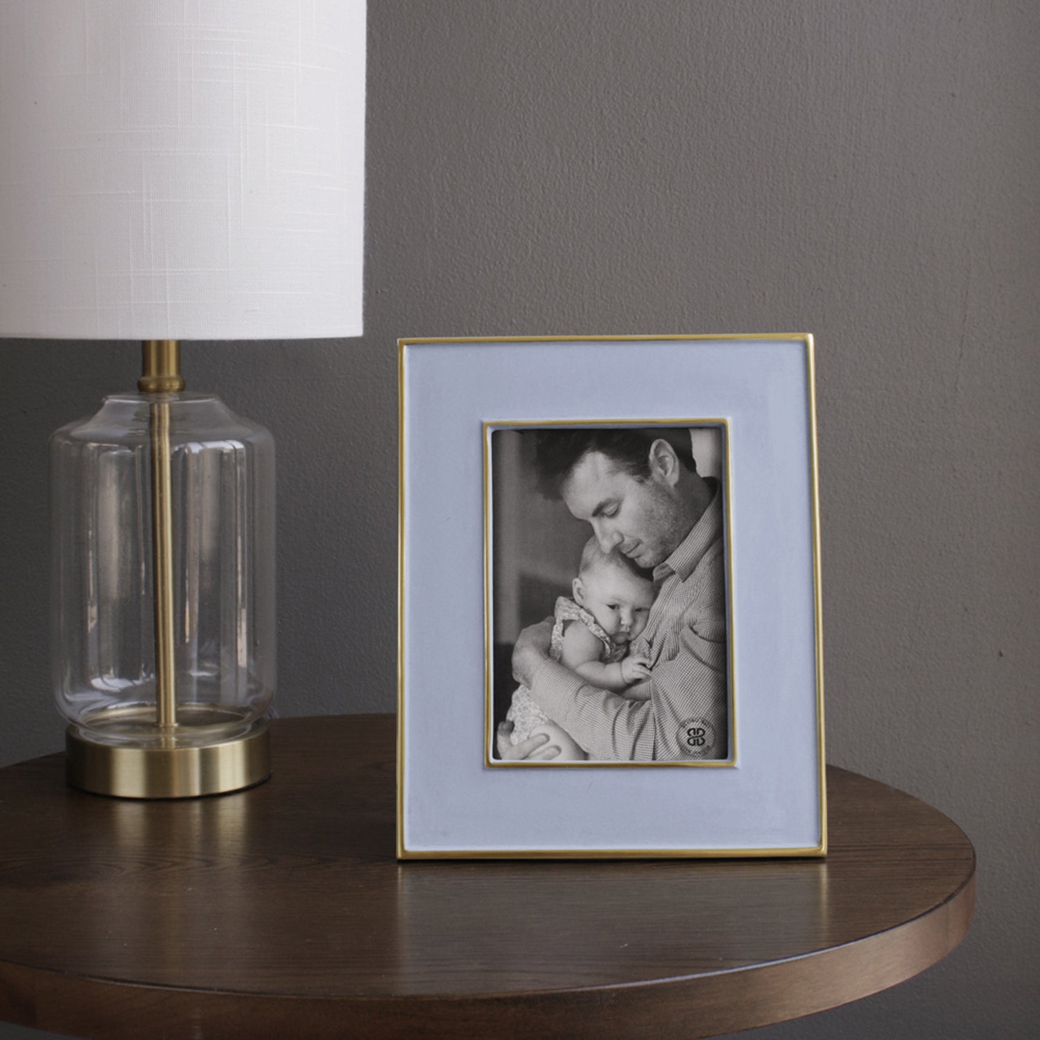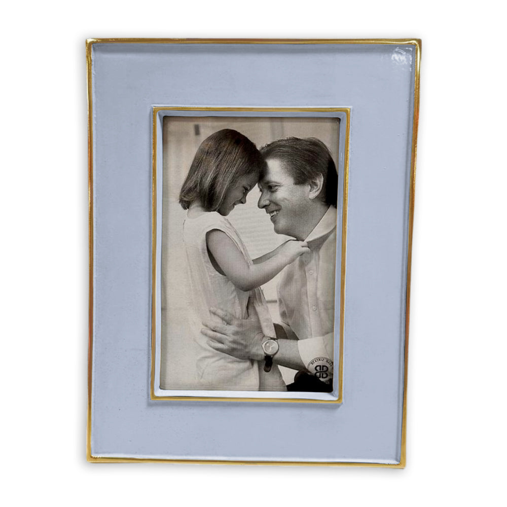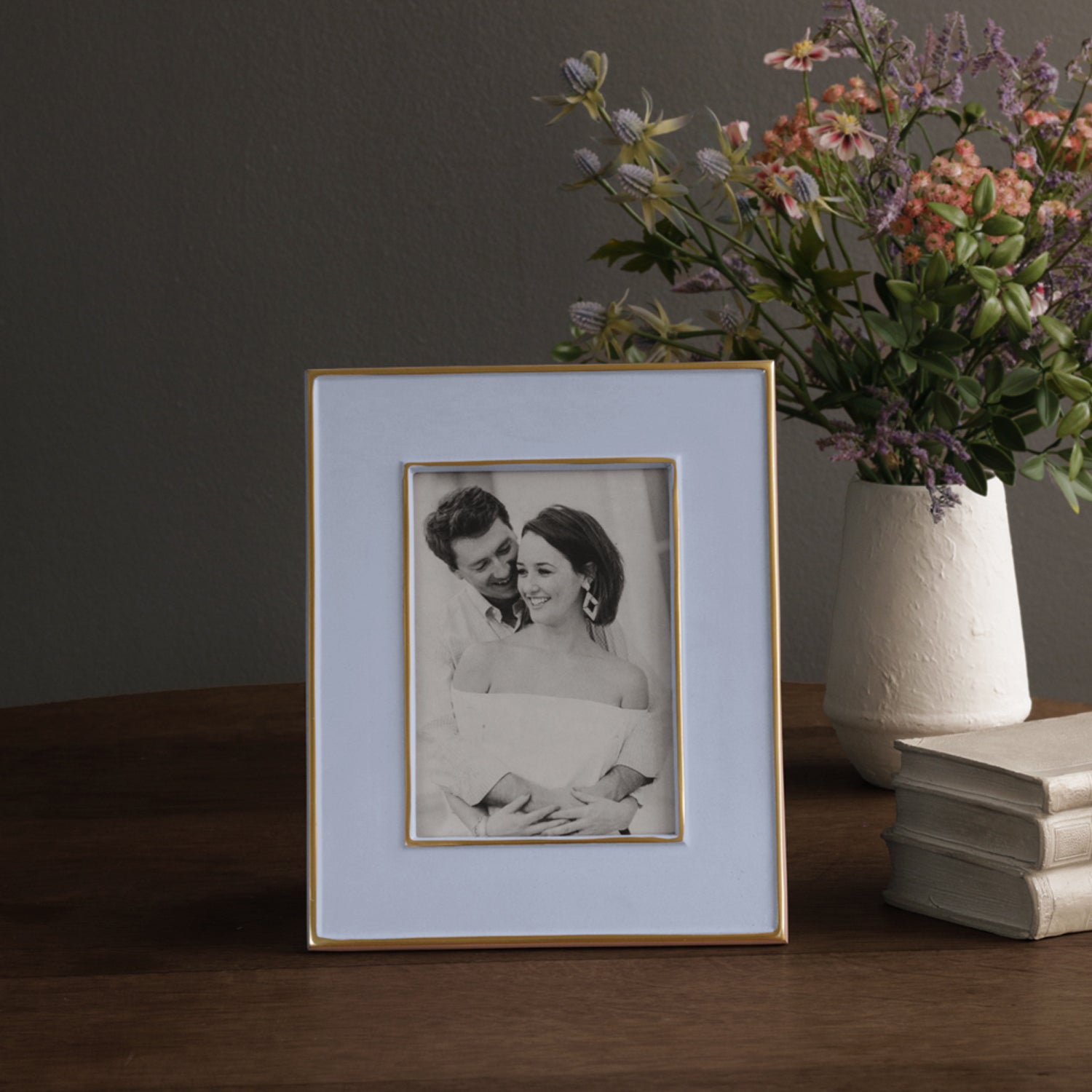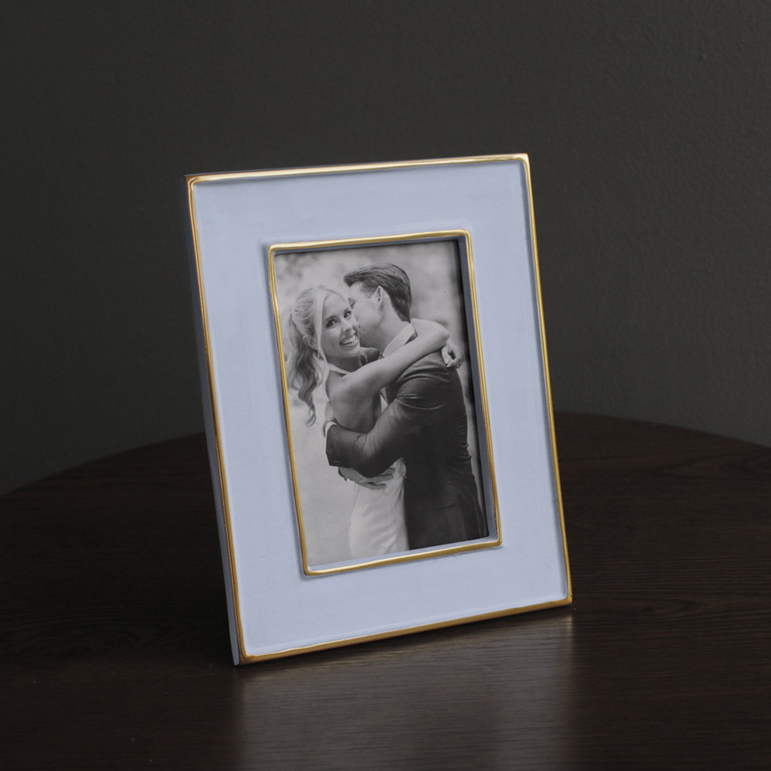 Beatriz Ball's FRAME Encanto Jason 5 x 7 (Periwinkle) is the very essence of beautifully sophisticated understatement, strikingly presented in colorfully enameled metal, rimmed in gold. With a precisely classic rectangular shape, the frame is ideal for displaying your favorite 5x7 photo in ENCANTO Jason style. Of heirloom quality, this frame may be displayed vertically or horizontally, and makes a perfect gift for any occassion. This handsome enameled frame will add a distinctive decorative touch to any room and will be cherished for years to come.