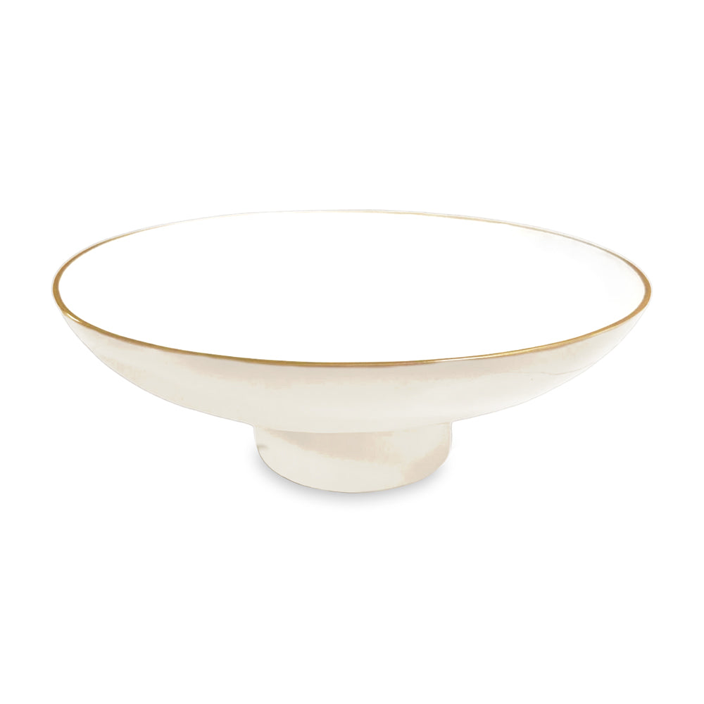 Elevated design. Notable for its clean lines, elegant shape, and brilliant two-tone finish rimmed in gold, the ENCANTO Carnaval Large Pedestal (Cream and White) is a fabulous design that is as practical as it is decorative. Ideal for fruit and desserts, combine with other ENCANTO Carnaval pieces for an elevated serving set. The ENCANTO Collection pieces are all about classic shapes, re-invented in lively colors. ENCANTO items are fabulous gift items for brides, and perfect for anyone who loves to entertain and decorate. Beatriz Ball’s intensely handmade products use eco-friendly and sustainable materials and are crafted by artisans who trace a heritage of metalworking for generations. Made of a top quality, easy-care, aluminum alloy with a food safe enamel finish. Dishwasher safe.