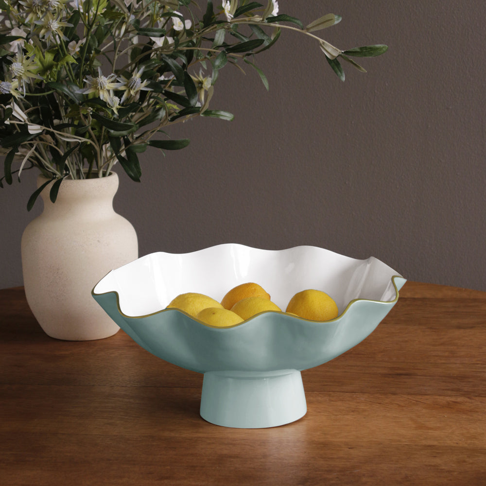 Next level design. Notable for its gently curving sides, elegant rise, and brilliant two-tone finish rimmed in gold, the ENCANTO Carola Large Pedestal (Turquoise and White) is a fabulous design that is as practical as it is decorative. Ideal for fruit, salads, snacks and sides, combine with other ENCANTO Carola pieces for an elevated serving set. The ENCANTO Collection pieces are all about classic shapes, re-invented in lively colors. Fashionably tailored in delightful colors, ENCANTO items are fabulous gift items for brides, and perfect for anyone who loves to entertain and decorate. On trend, their beautiful designs with curving forms add grace and sophistication to any setting. Makes an awesome centerpiece! Beatriz Ball’s intensely handmade products use eco-friendly and sustainable materials and are crafted by artisans who trace a heritage of metalworking for generations. Made of a top quality, easy-care, aluminum alloy with a food safe enamel finish. Dishwasher safe.