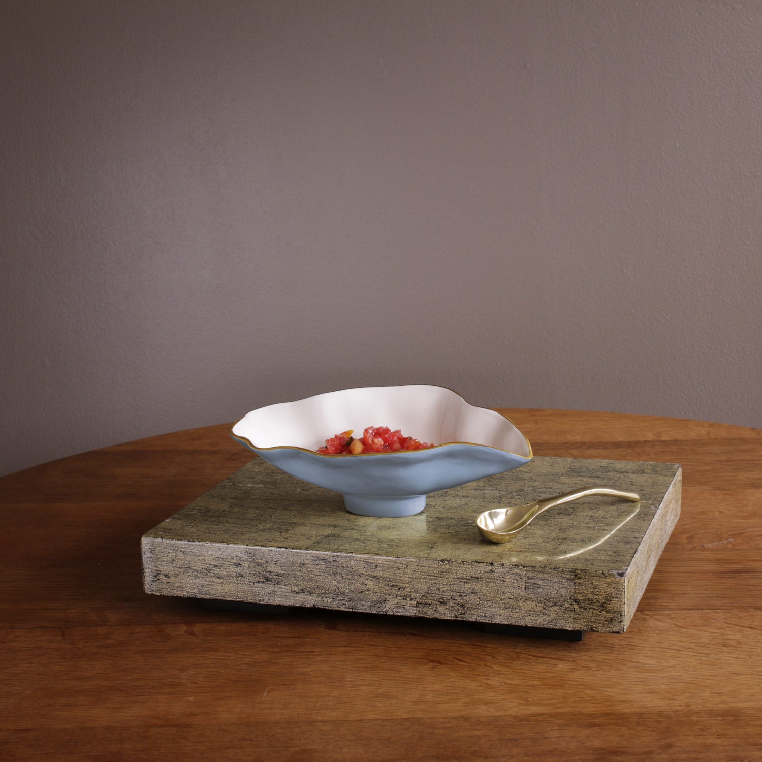Spoon up something wonderful in the ENCANTO Claire Small Oval Bowl with Spoon (Periwinkle, White and Gold) from Beatriz Ball! The sensational 2-part piece is notable for its generous shape, brilliant two-tone finish rimmed in gold and exuberant design; the accompanying spoon makes it an item that's sure to delight. Great for serving salsa, sauces or sides, the bowl and spoon combo makes a dramatic statement wherever it is placed. ENCANTO pieces are fabulous gift items for brides, and perfect for anyone who loves to entertain or decorate. Beatriz Ball’s intensely handmade products use eco-friendly and sustainable materials and are crafted by artisans who trace a heritage of metalworking for generations. Made of a top quality, easy-care, aluminum alloy with a food safe enamel finish. Dishwasher safe.