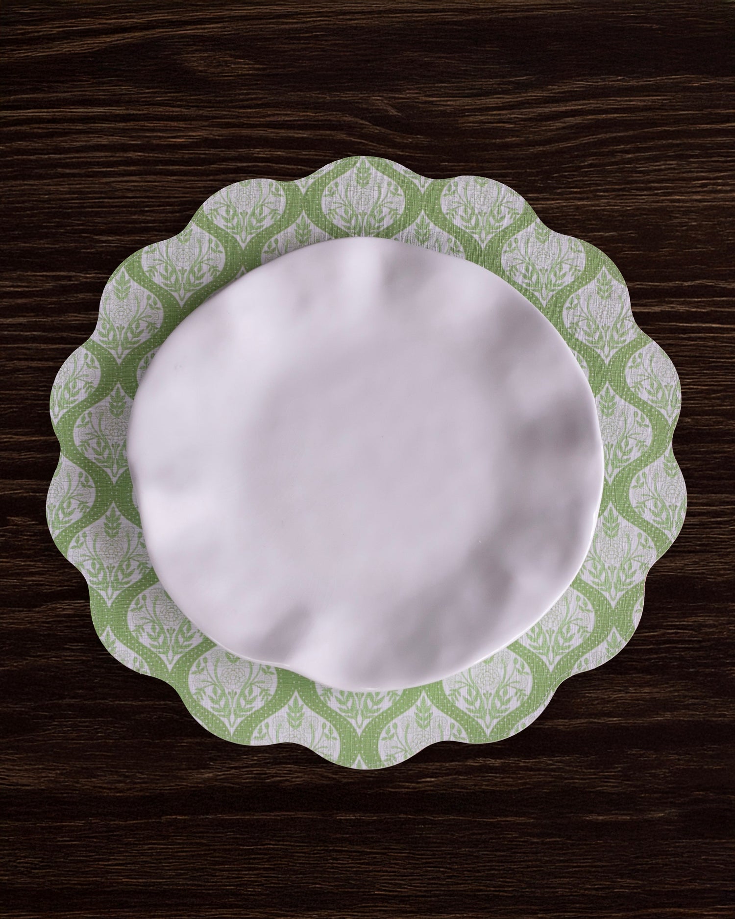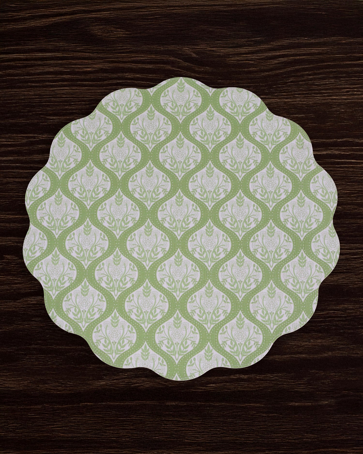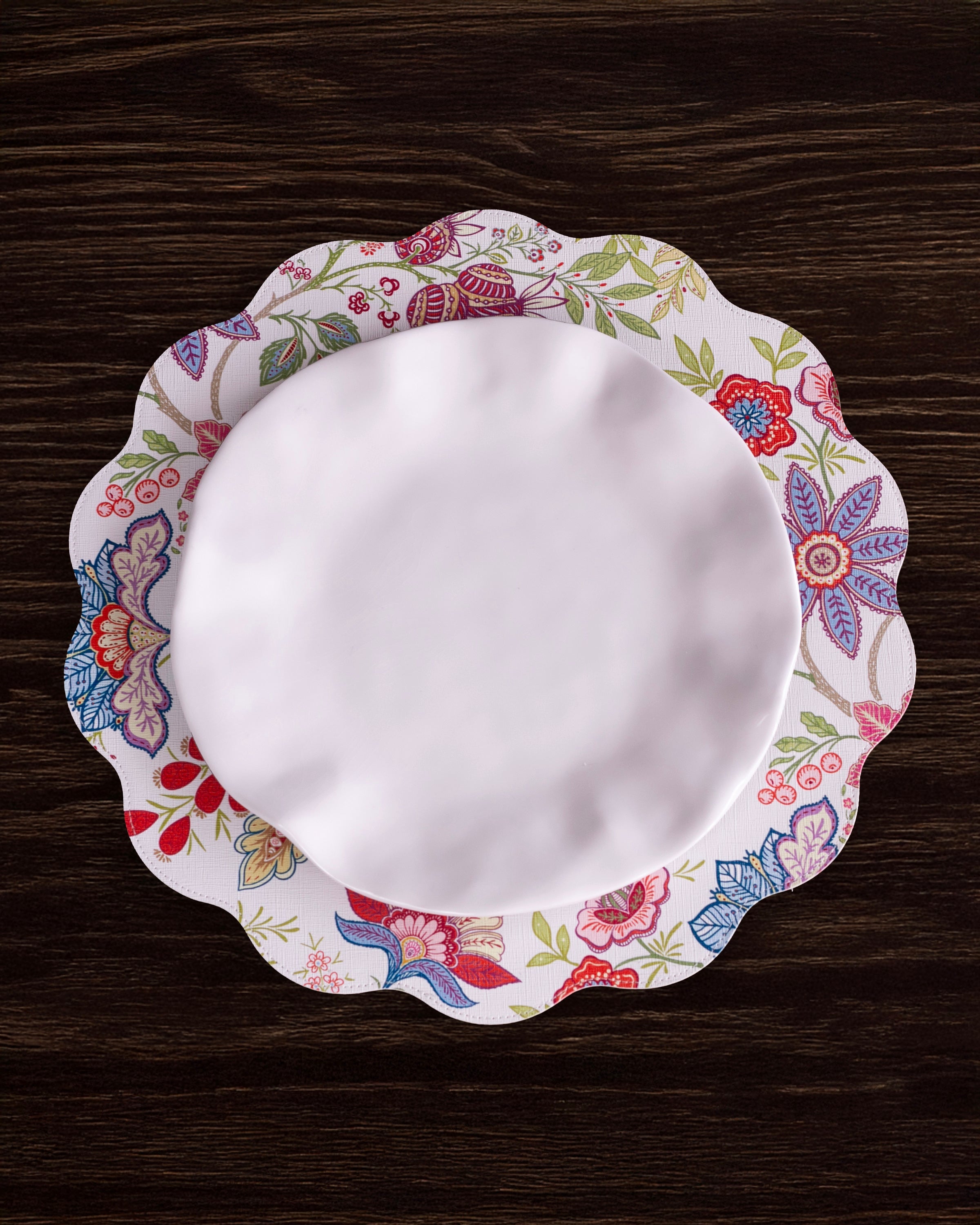Twice as nice. Sold in sets of four, the VIDA Blooms & Branches Reversible Round Placemats in periwinkle & peach have a supple leather-like feel and linen texture. One side features a classic Jacobean motif; the reverse offers a stylized floral pattern in soft periwinkle and peach tones.