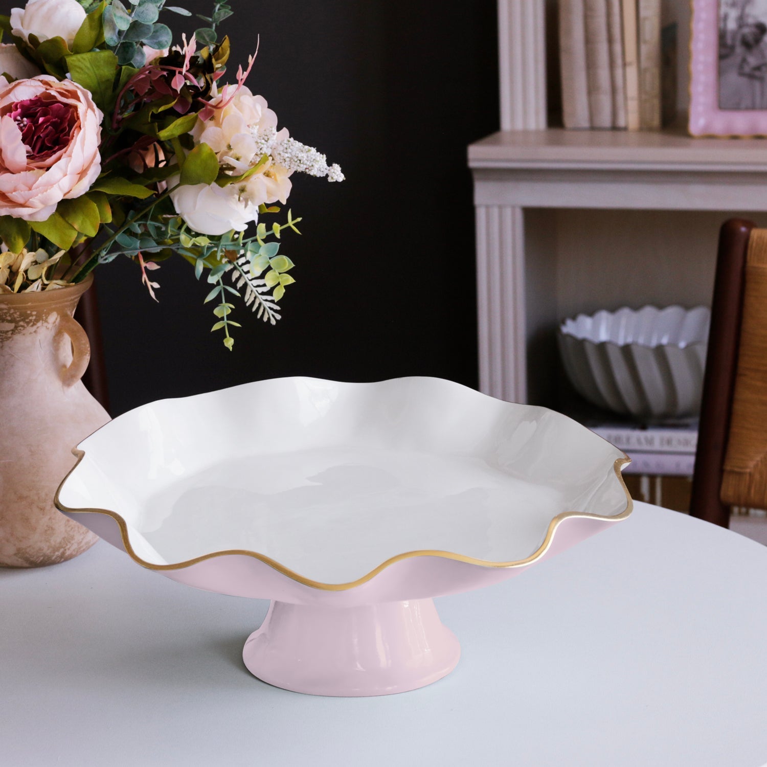 Elevate your style with the ENCANTO Carola Pedestal Cake Plate (Camellia and White). With its curving silhouette, elegant rise, and luminous two-tone finish accented with gold, this piece is both practical and decorative. Camellia, a delicate blush pink, brings a soft, soothing note of romance and elegance to any setting.