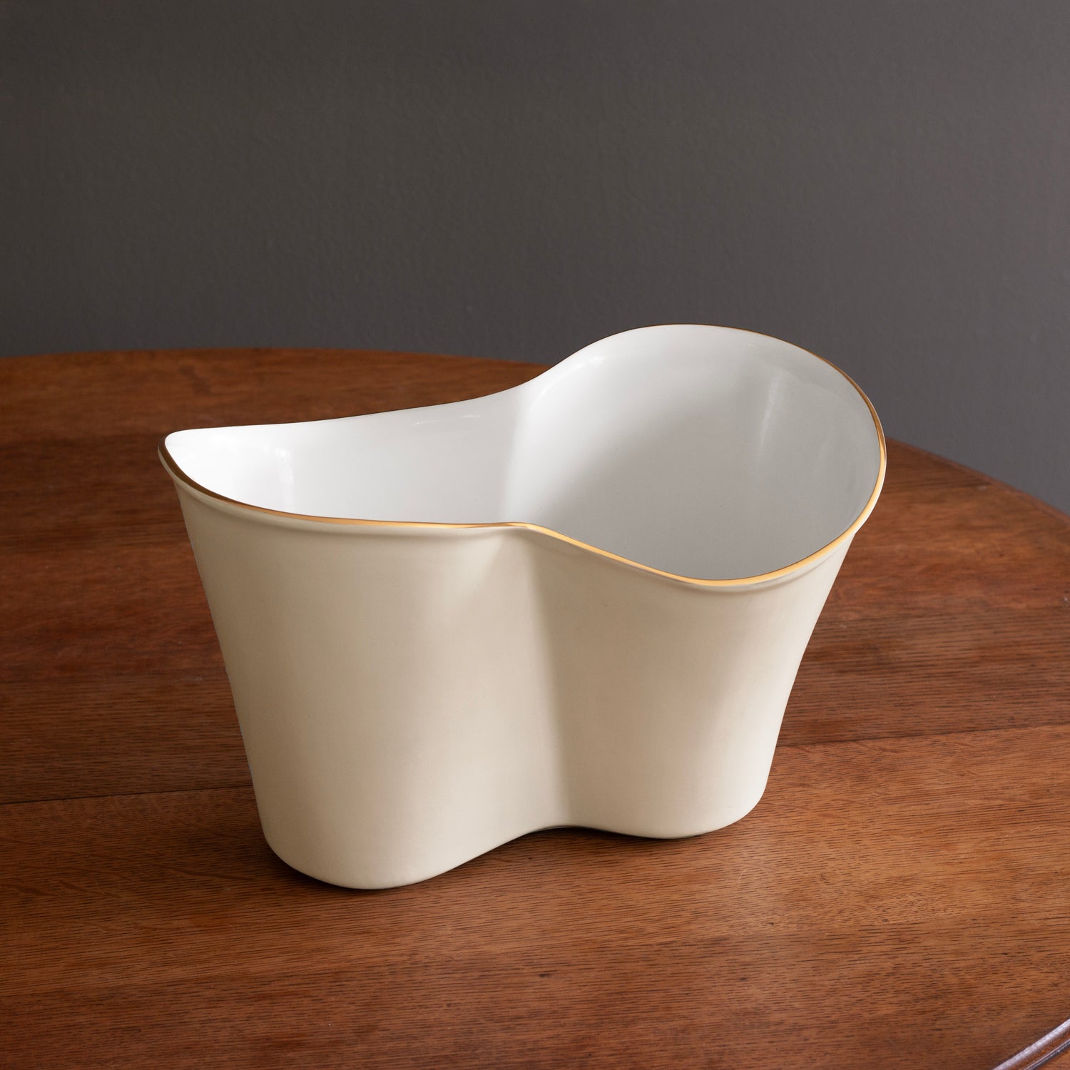 On trend, beautifully functional and wildly attractive, Beatriz Ball’s ENCANTO Double Ice Bucket (Cream and White) is a singular metal serving piece reminiscent of the best of contemporary art but utilizing practical materials for the ease of today’s busy lifestyles. The striking sculptural form is notable for its brilliant two-tone finish rimmed in gold, flaring shape, dramatic depth, and daring double form. Its generous figure-8 opening holds two bottles of wine. A great luxe piece with plenty of eye-appeal on the bar or kitchen island. Makes a fabulous gift for the wine lover, or anyone who loves to entertain in style.