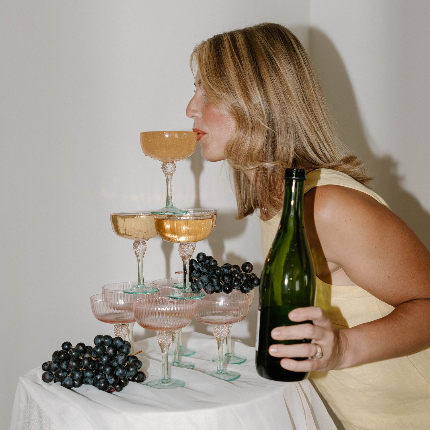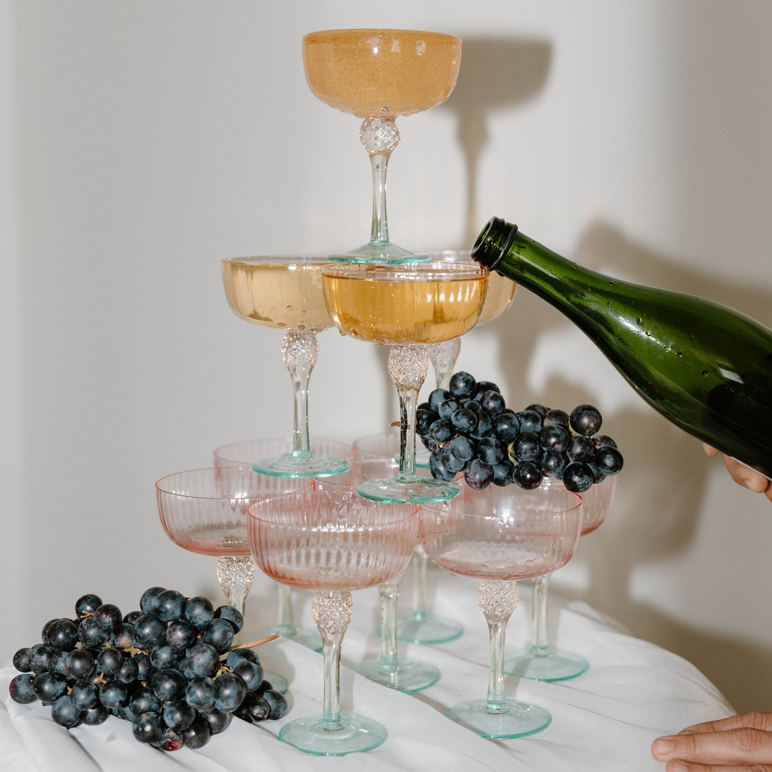 Cheers! Beatriz Ball is all about making your home a joyful reflection of you--with vibrant colors and accessories that spark happiness. Introducing our multi-colored GLASS Aquarelle Collection, featuring tints that remind you of watercolors. Vibrant masterpieces! Each piece is a work of art, made one at a time by skilled artisans and guaranteed to put a smile on your face. There's a rainbow of options; choose between stemmed flutes and coupes with a different color on each segment, or go for stemless highball, DOF, and all-purpose glasses in two distinctive colors. Our GLASS Aquarelle Coupe Set of 4 (Multi) is an elegant classic that's ideal for champagne and sparkling wines. Featuring chic fluting and gem-like details, the 8oz piece combines shimmering pink, yellow and green tones. Mix & match fun! Find the perfect glass for your favorite cocktail or beverage. Mix and match colors to create a unique serving experience (and boost your party's awesomeness). Sold as sets of four. Grab a set and prepare for a colorful party! These beauties are sure to turn heads and make everyone say "Cheers!" Handwash only. Because these are practically works of art, we recommend a gentle hand wash to keep them sparkling for years to come.