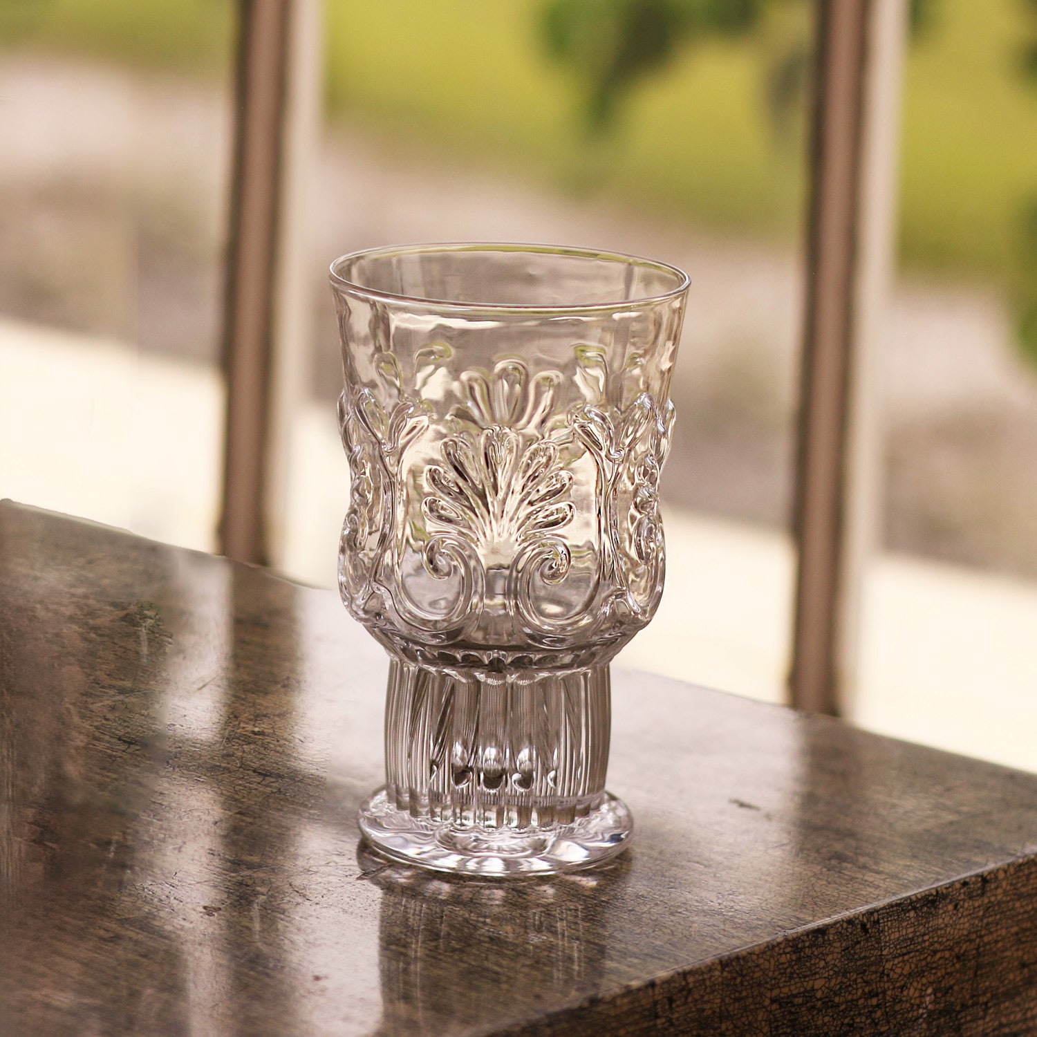 This beautiful GLASS Baroque 6oz Stemless Set of 4 (Clear) is alive with texture. The hefty cast drinking glass with a flared rim sits naturally in the hand, and the bold base detail adds a special touch.