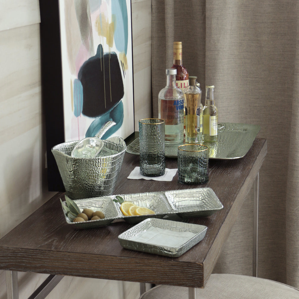 Raise a toast with this high-fashion 18 oz highball featuring a stunning textured crocodile pattern in smoked glass with metallic gold halo rim. The GLASS Croc Highball with Gold Rim Set of 4 (Smoke Grey) is the last word in stylish sophistication for glassware. Paired together, the DOF and Highball glasses look absolutely amazing on top of trays from our PIELES and SIERRA MODERN Croc collections. Great gift for men. Set of four.