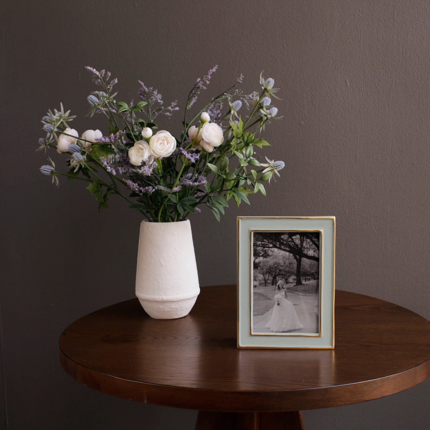 Impeccable design in Slate. The Encanto Jason Frame 4 x 6 (Slate) combines a trim rectangular profile, glossy enamel rimmed in gold, and timeless proportions that enhance any photograph. The Slate tone—a calm, slate-inflected neutral blue—adds contemporary sophistication.