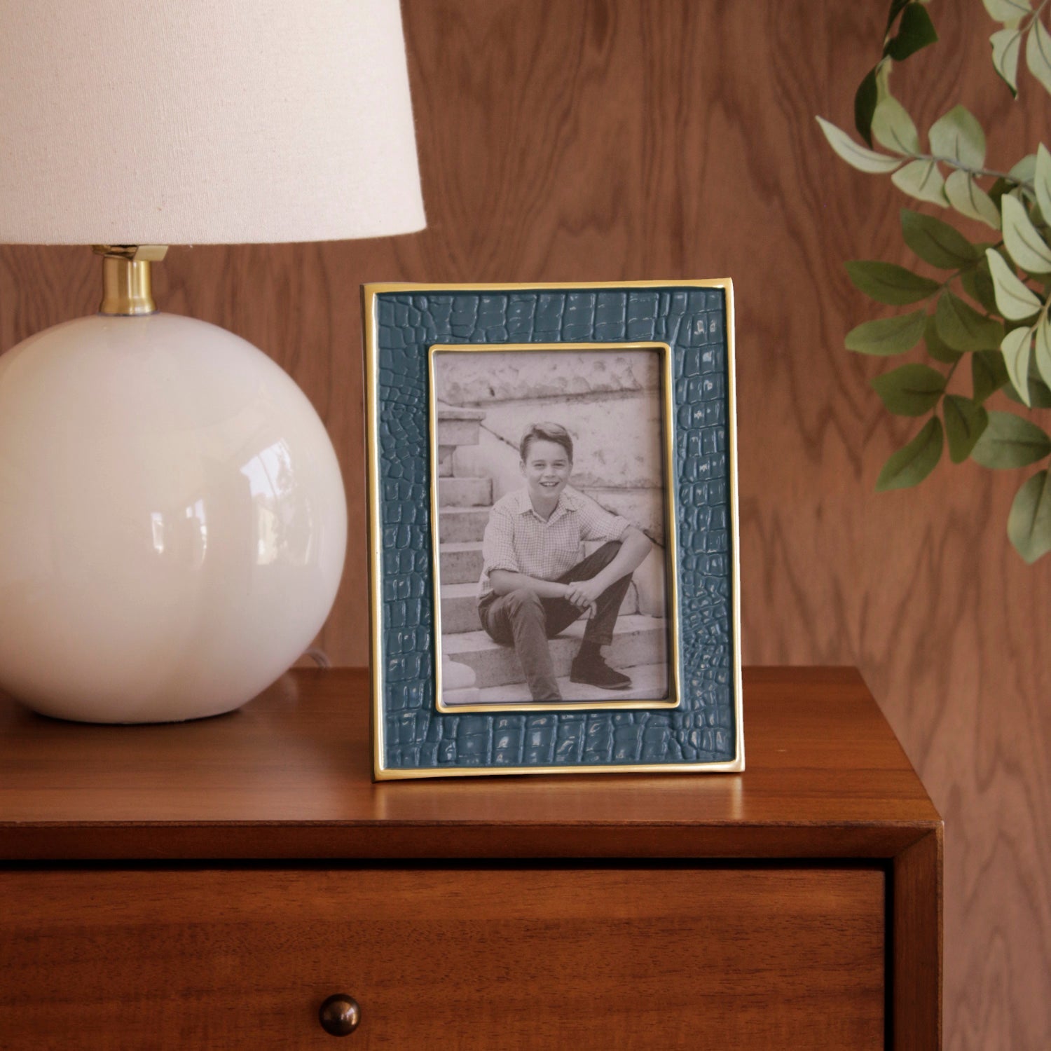 Bold texture meets modern elegance. The Encanto Croc 4x6 Frame in midnight features a deep midnight-blue enamel finish with a distinctive crocodile pattern, framed in gold for a striking presentation of your favorite 4x6 photo. Designed for vertical or horizontal display.