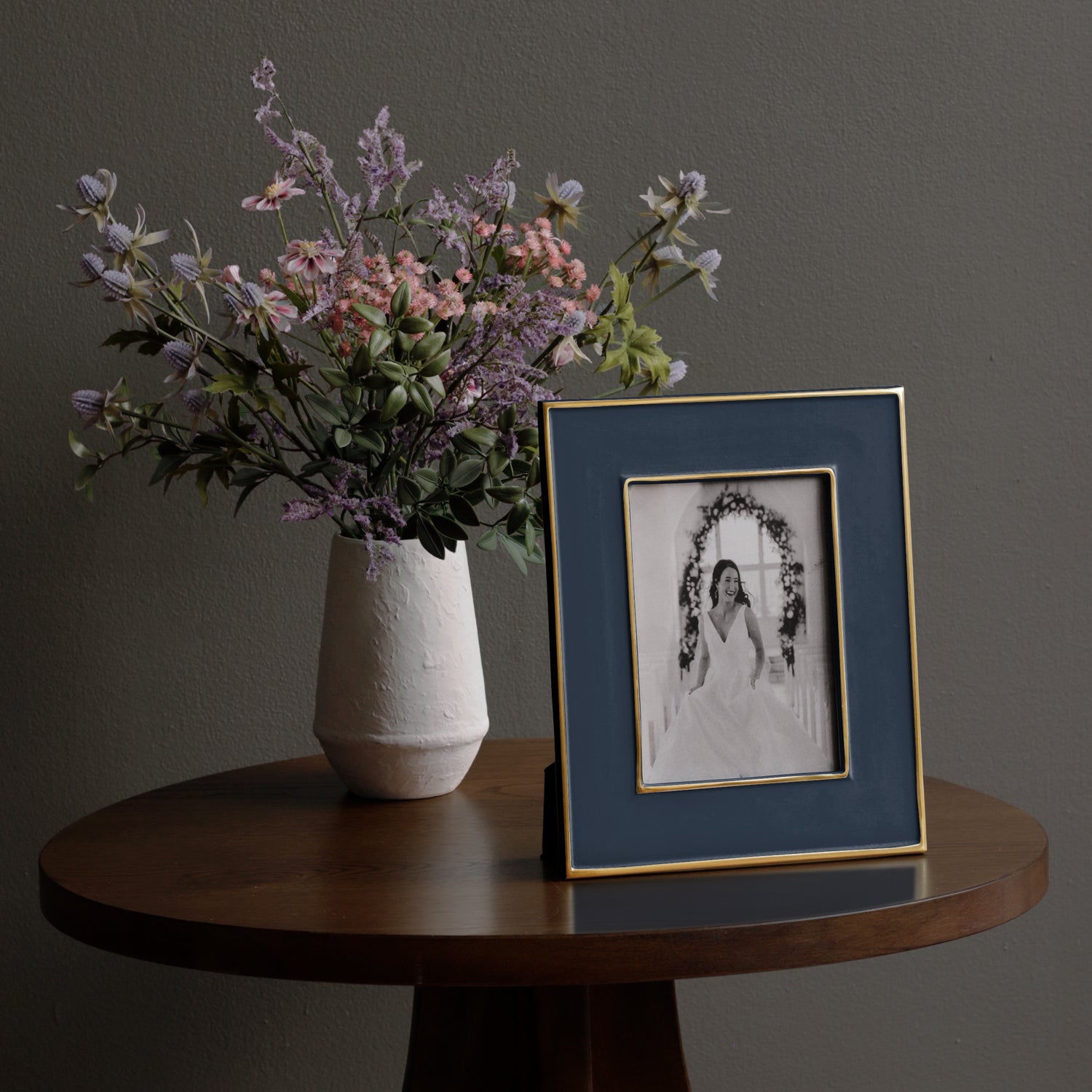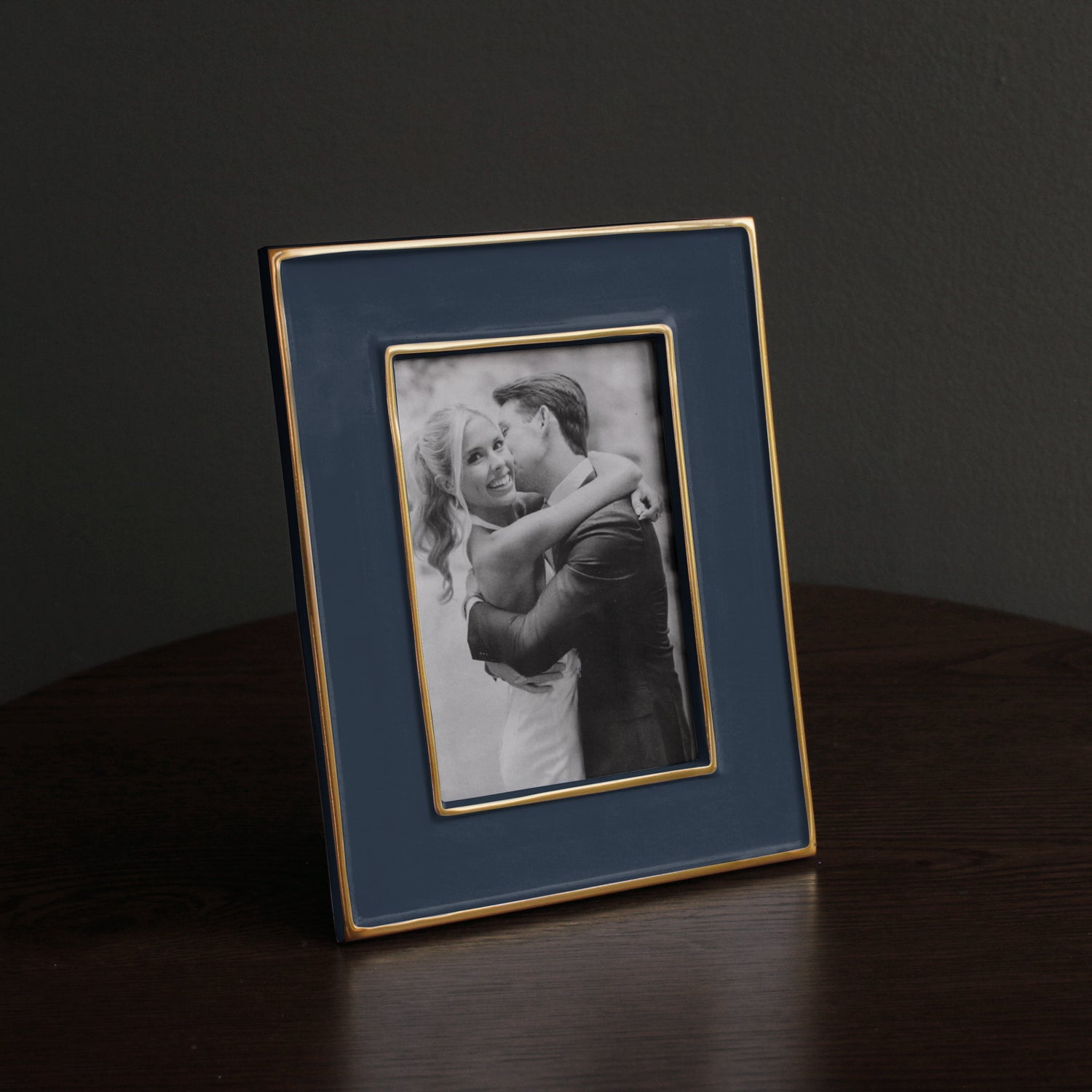Elegant in Midnight. The Encanto Jason Frame 5 x 7 (Midnight) features a wide rectangular border in deep enamel, rimmed in luminous gold, and crafted with timeless sophistication. Perfect for displaying a treasured 5x7 photo, it doubles as a refined decorative accent for the home. The Midnight tone, a rich and dramatic blue, adds striking depth to any setting.