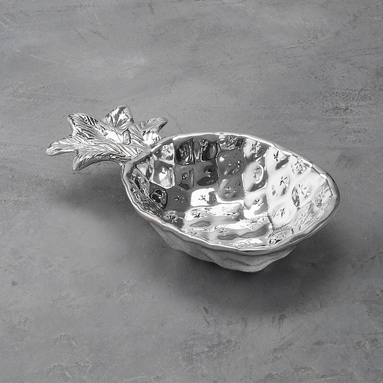 Welcome! The pineapple--the universal symbol of hospitality--makes a welcome appearance in this delightful original design by Beatriz Ball. With its sculptural form and richly detailed surface, the gleaming GIFTABLES Garden Pineapple Mini Bowl makes a perfect hostess gift. We like it for serving pineapple salsa (naturally!), or as a charming decorative accent on the entry table. The GIFTABLES Collection features handmade and artfully designed Beatriz Ball items at irresistible prices; each packaged in a lovely gift box. Of heirloom quality, this little charmer makes lovely present for the Holidays, birthdays, anniversaries, and other swinging occasions. Handmade of an FDA safe, easy-care aluminum alloy.
