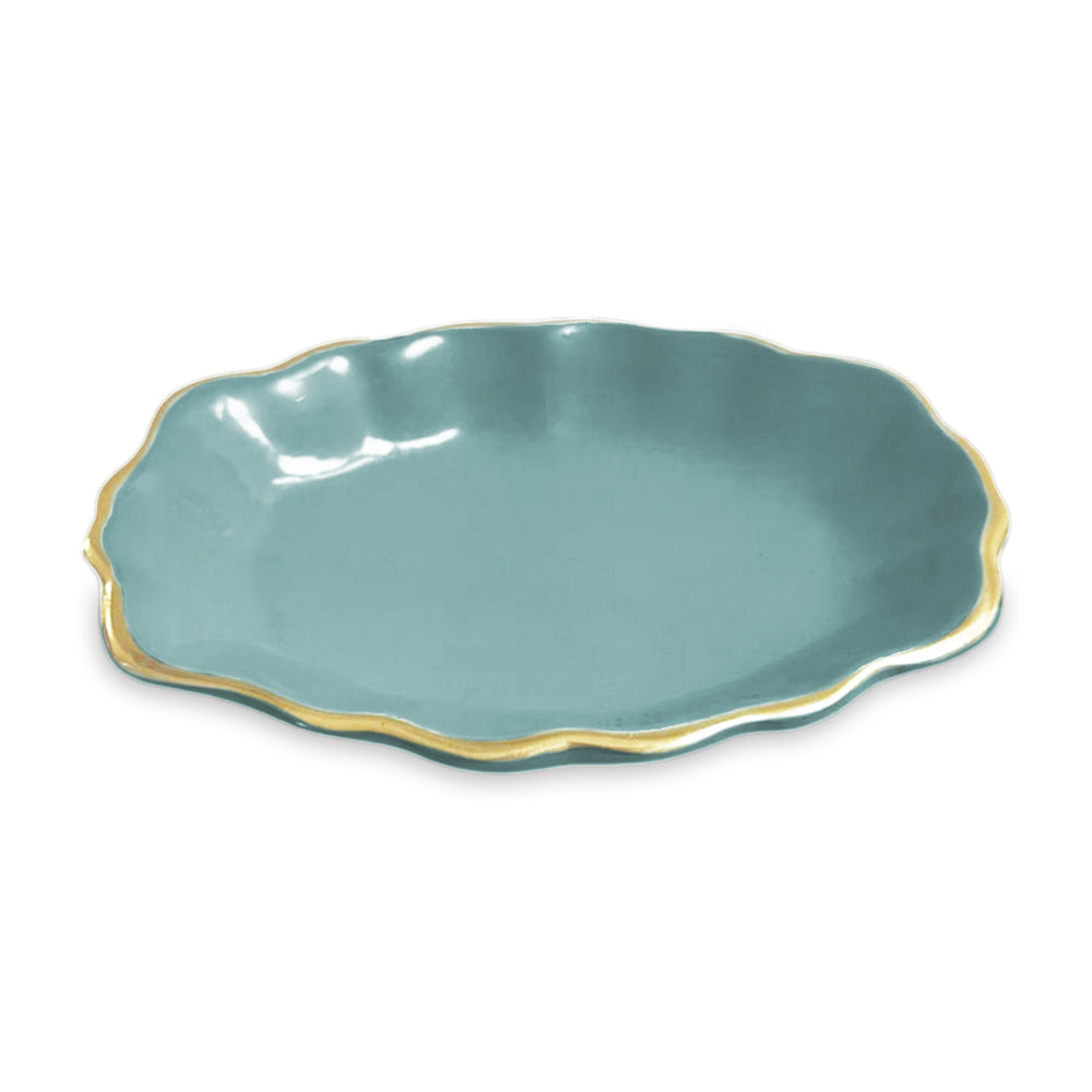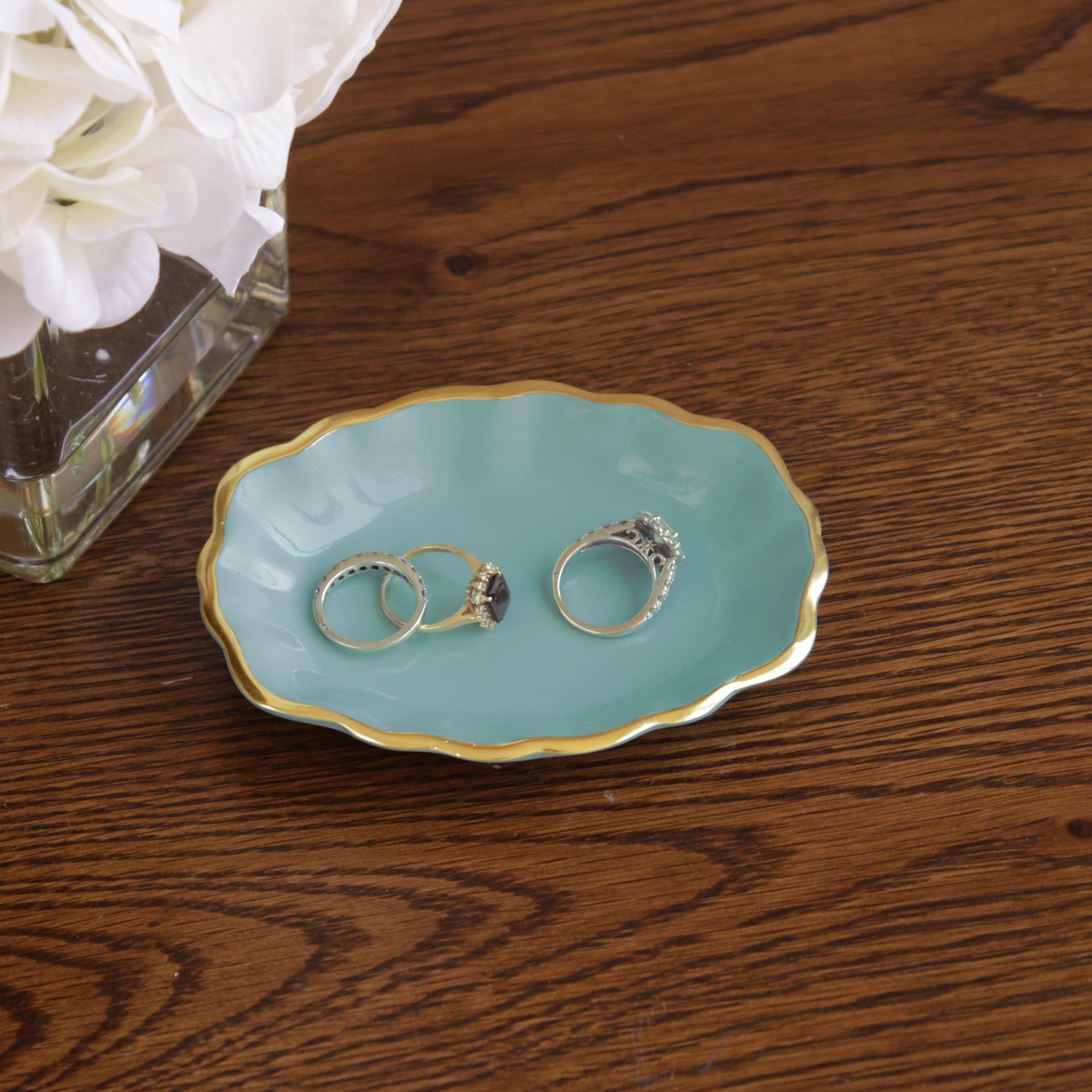 Notable for its elegant shape, and brilliant enameled finish, rimmed in gold, the ENCANTO Ring Holder (Turquoise) is great on the vanity, or use to hold earrings and other small jewelry on your bedside table. Beatriz Ballโ€™s intensely handmade products use eco-friendly and sustainable materials and are crafted by artisans who trace a heritage of metalworking for generations. Made of a top quality, easy-care, aluminum alloy with an enamel finish. This item is for decorative purposes only.