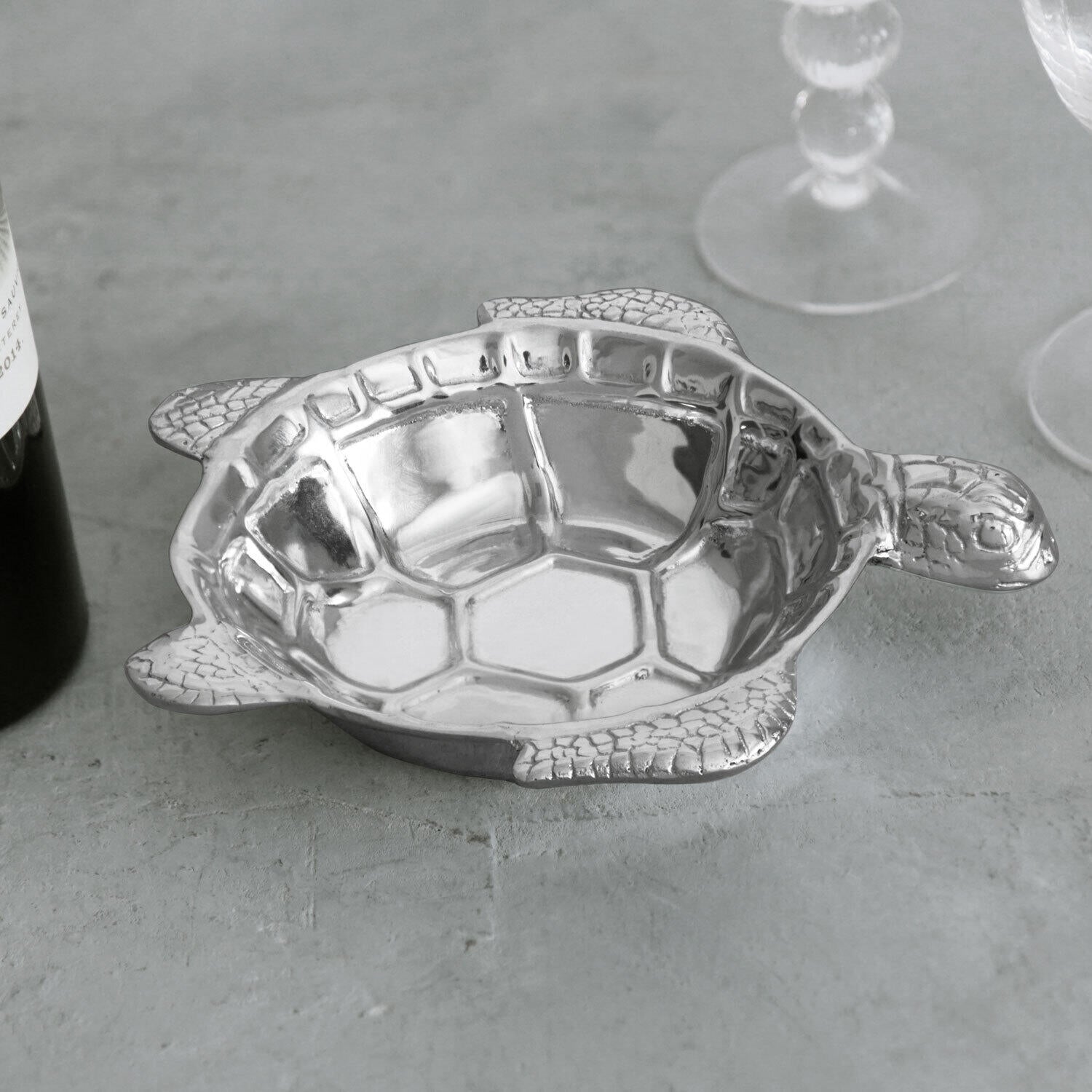 So cute! Yes, the OCEAN Turtle Wine Coaster just might be the cutest wine coaster Beatriz Ball ever designed. Beautifully detailed, the darling little coaster serves a large and important function when serving wine on a tablecloth. In addition to its wine coaster duties, the OCEAN Turtle Wine Coaster offers a seaside twist for serving dips, nuts, candies and other little nibbles. A great gift for the wine-lover or beach house owner. Beatriz Ballโ€™s intensely handmade products employ eco-friendly and sustainable materials, and are crafted by artisans who trace a heritage of metalworking for generations. An original Beatriz Ball design, sustainably handmade of a top quality, FDA safe, easy-care, oven and freezer friendly aluminum alloy.