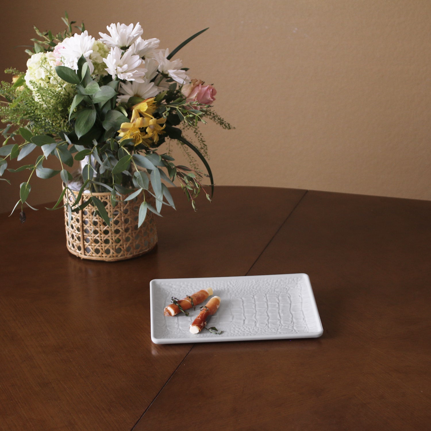 Made of luxury melamine with a classic crocodile texture, our VIDA Croc Small Rectangular Tray (White) adds instant sophistication wherever it is placed. A clean and modern shape and robust texture combine for dramatic effect in this smart looking tray in luxury melamine. This handsome tray is supremely versatile and makes an attractive decorative accent.
