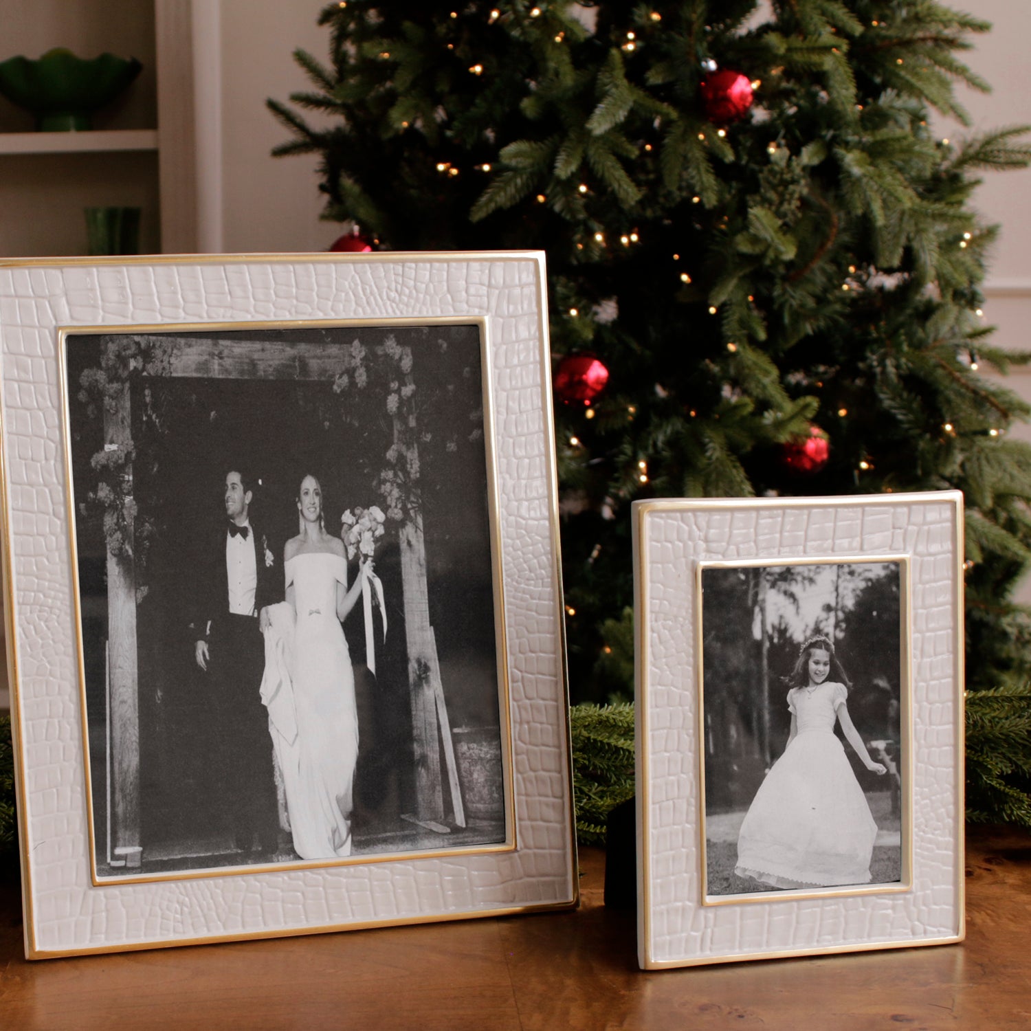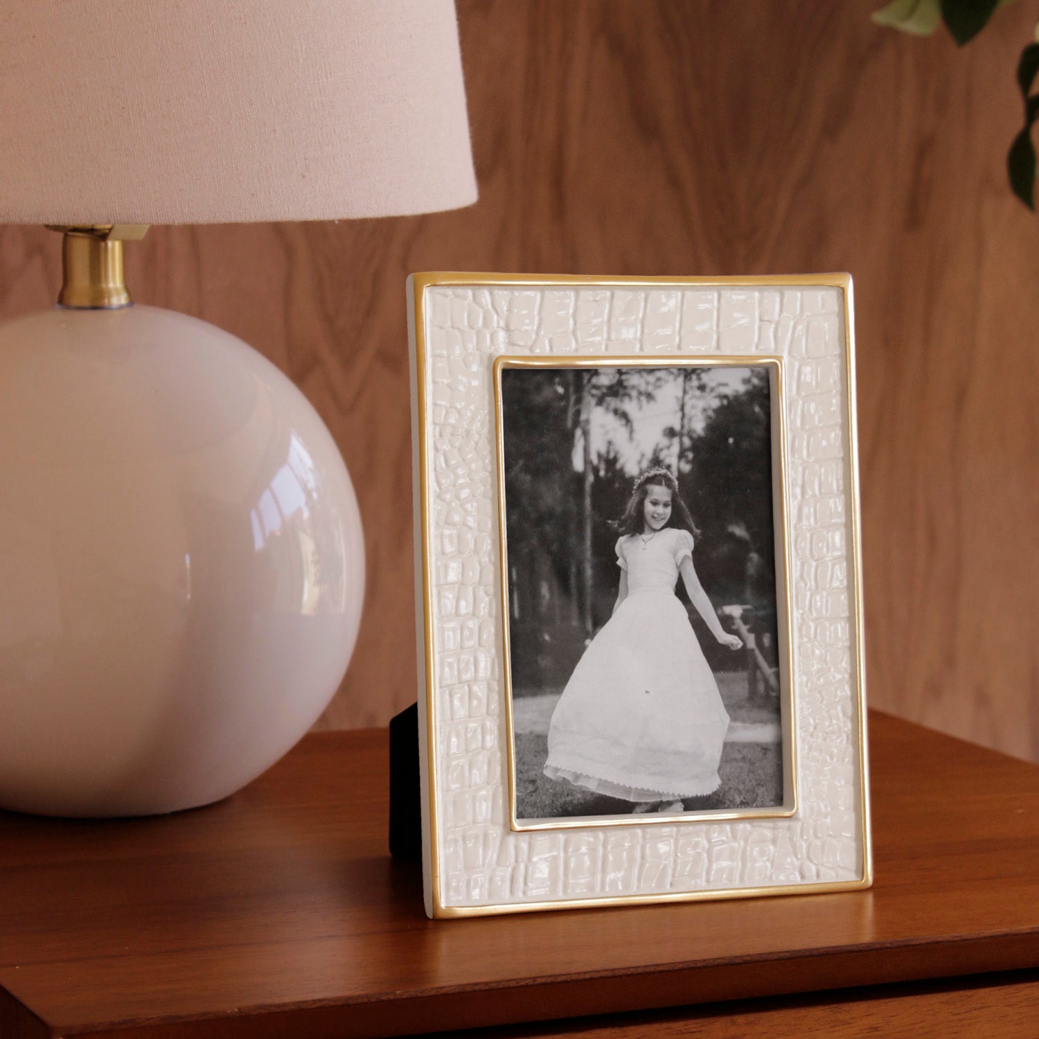The Encanto Croc 4x6 Frame in cream features a crocodile-textured enamel finish with gold-tone trim for a refined presentation of your favorite 4x6 photo; displays vertically or horizontally.