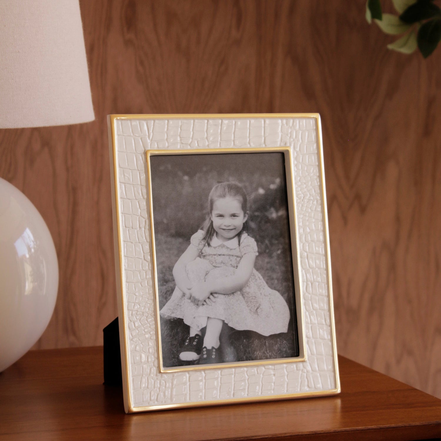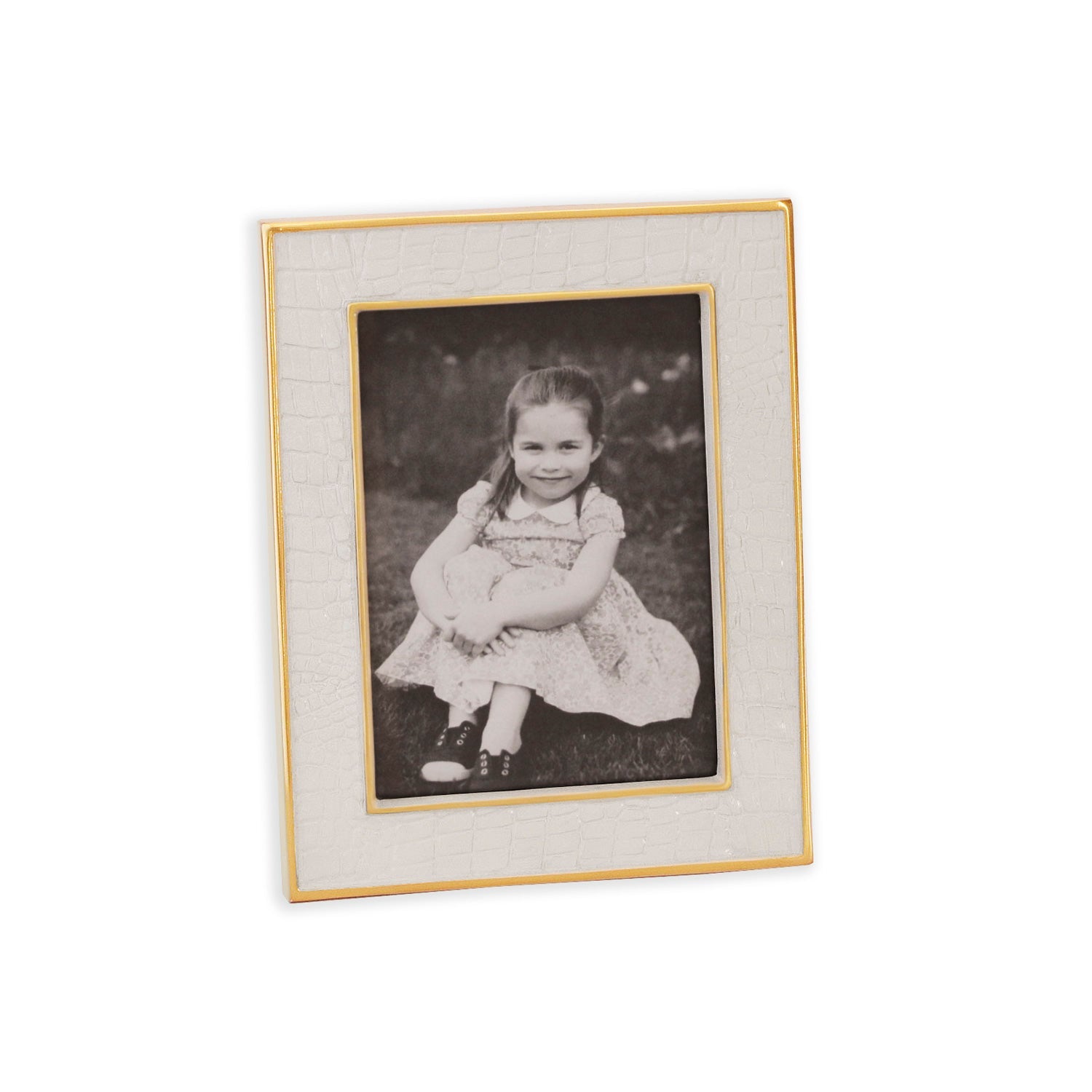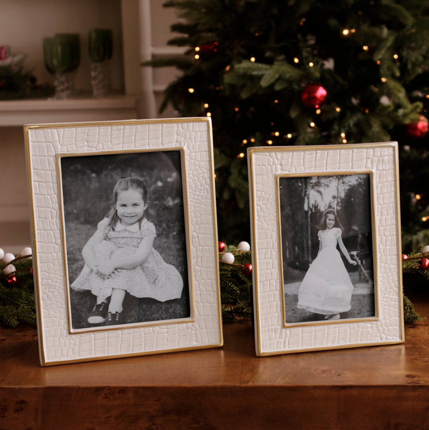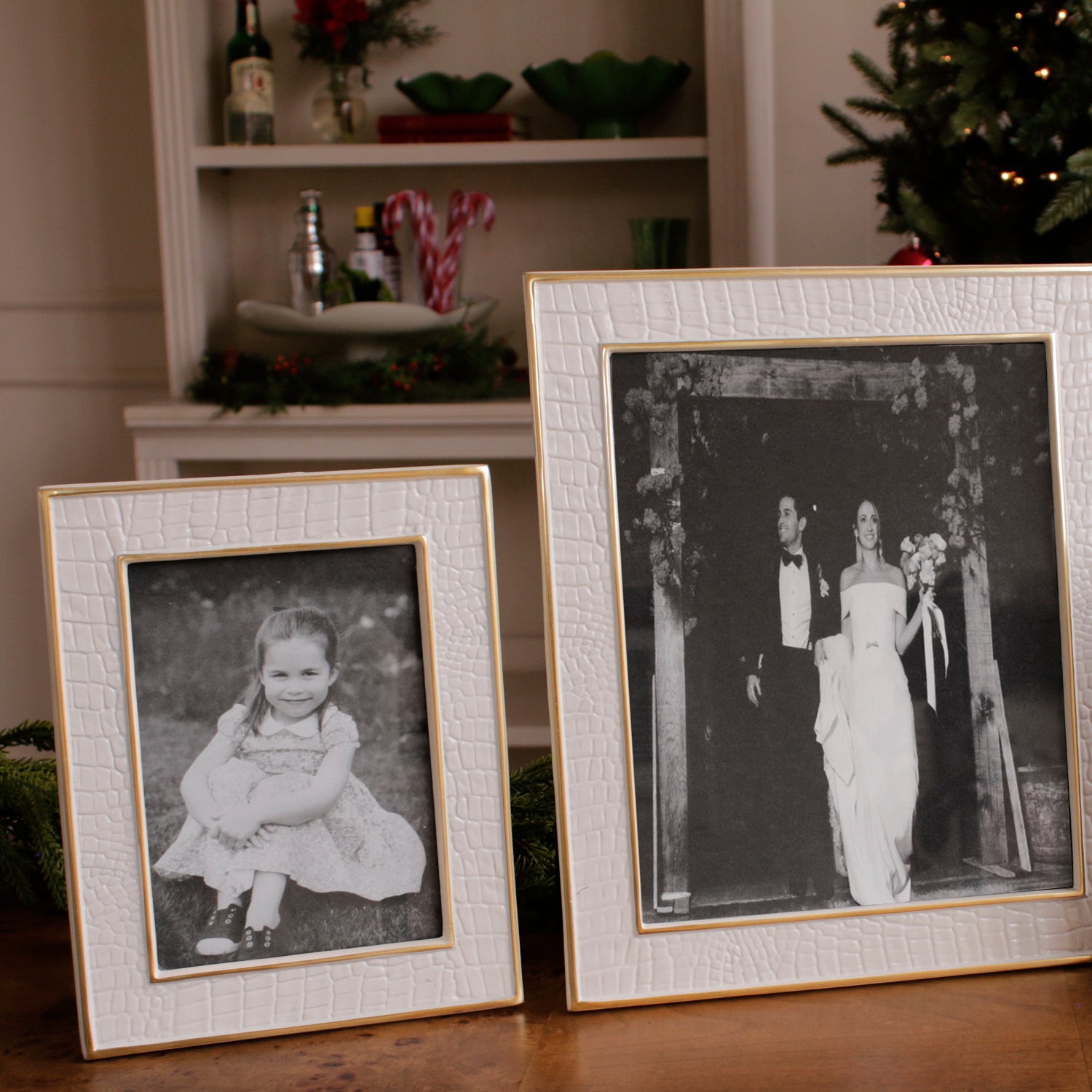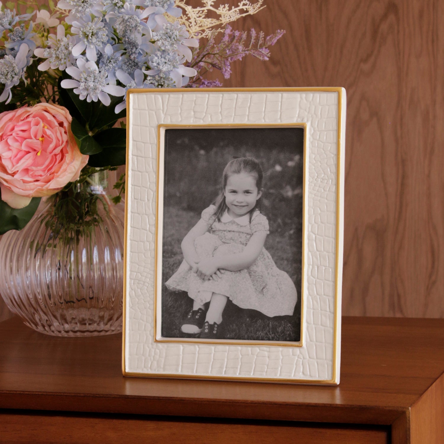 The Encanto Croc 5x7 Frame in cream showcases a sleek slate-toned enamel with crocodile texture and gold-tone accents; displays vertically or horizontally.