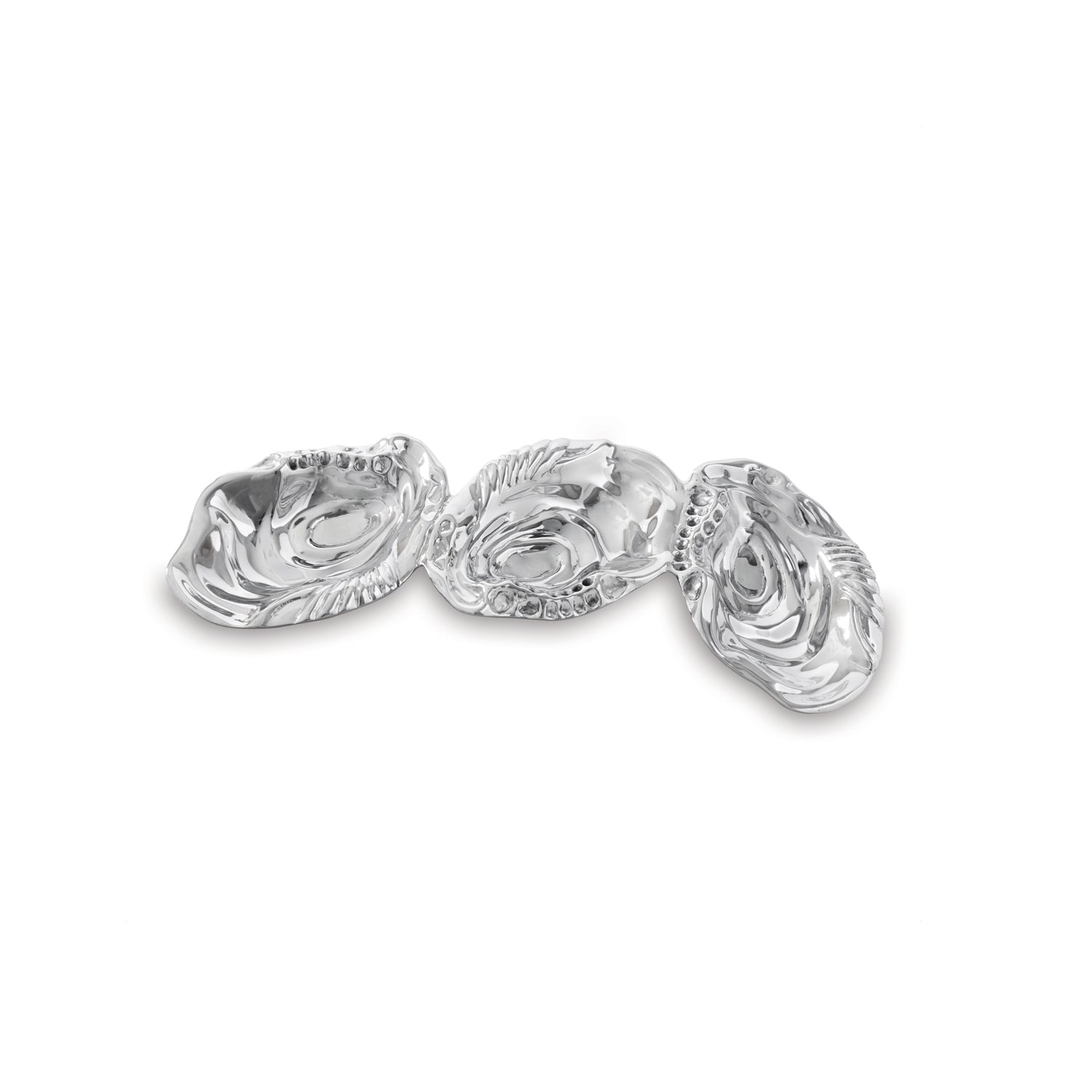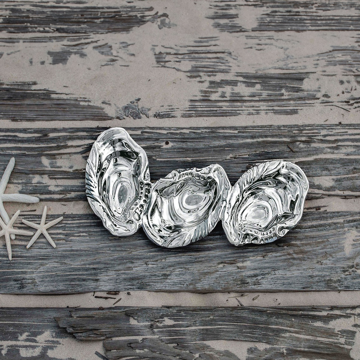 The OCEAN Triple Oyster Dip is composed of three linked oyster shells, artfully rendered in a gleaming, sand-cast metal.