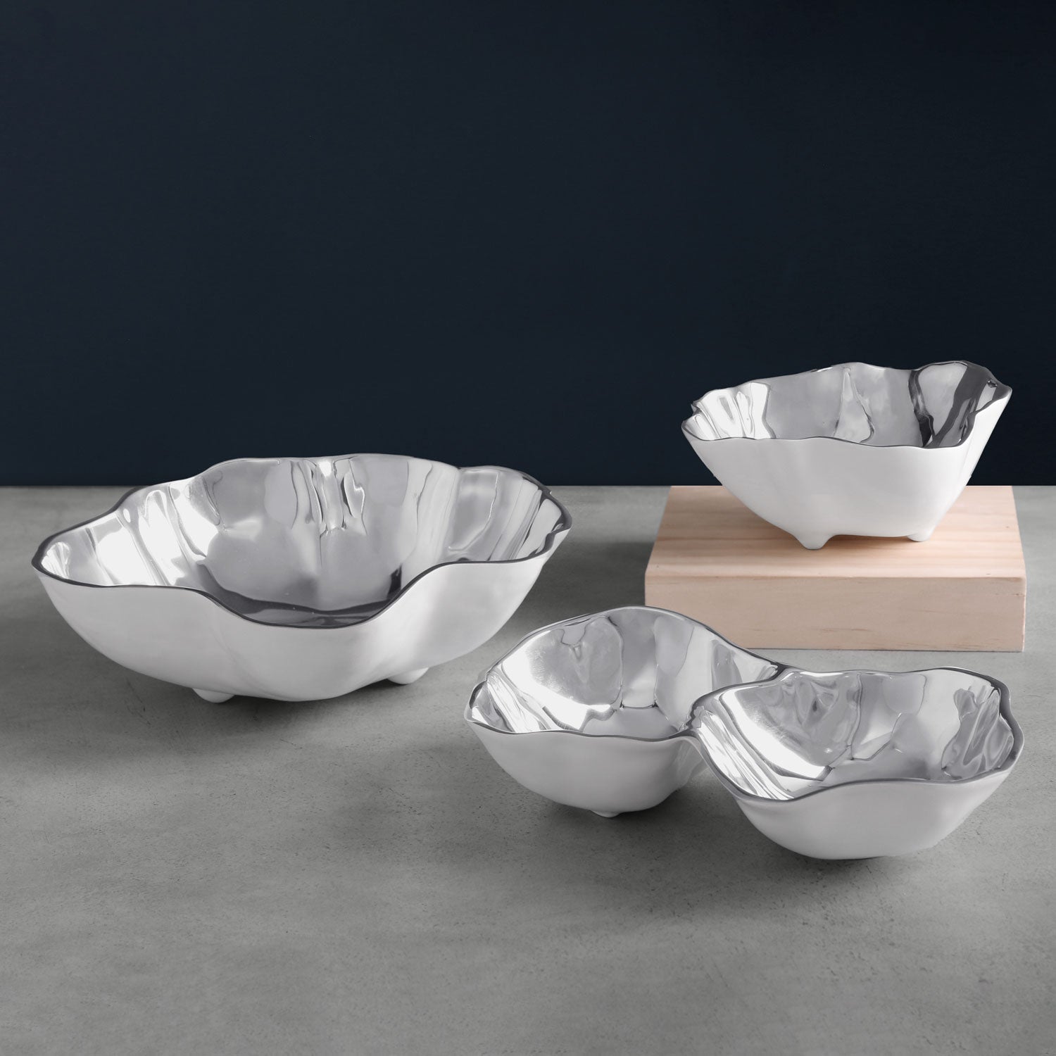 The THANNI Onyx Small Bowl (White and Silver) is so versatile it will be your go-to bowl for snacks, dips, salsas, and so much more. Pair it with a larger THANNI Onyx bowl for an improvised, but inspired chip and dip set.