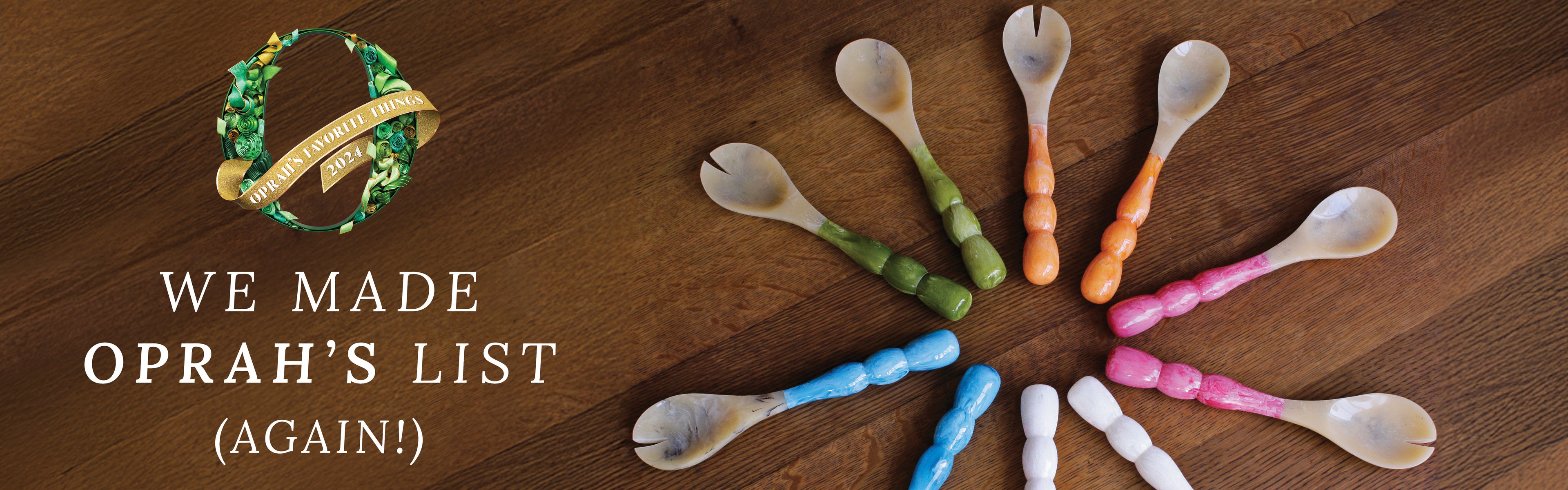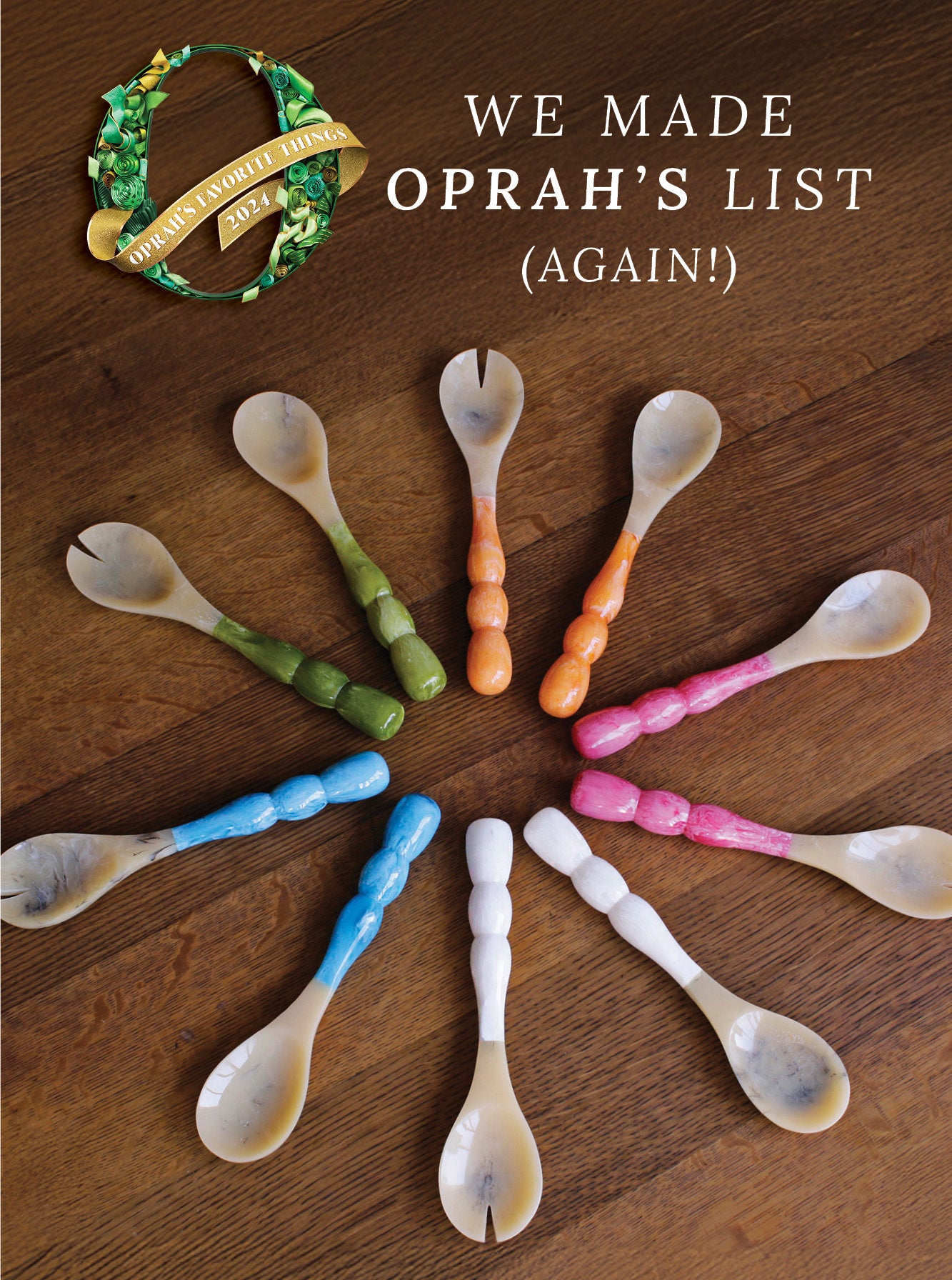 Beatriz Ball's Resin Rio Bubble Salad Servers selected as one of Oprah's Favorite Things 2024. Available in White, Green, Pink, Blue and Orange with tines and spoons resembling natural horn. Colorful designs that bring life and fun to your table.