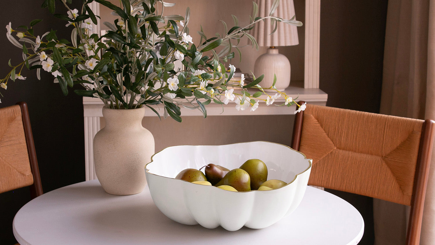 Free-form, fluid lines, and undulating surface are punctuated with a border of shimmering metal pearls, highlighting the handmade craftsmanship of the ORGANIC PEARL Nova Round Platter.