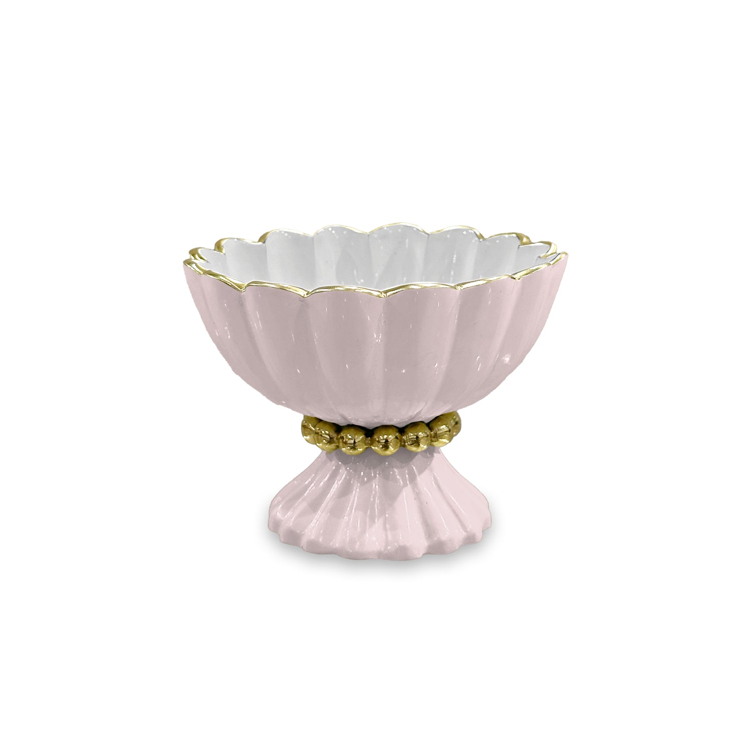 Small but statement-making. The ENCANTO Vienna Mini Pedestal with Spoon in Camellia and White pairs timeless detailing with a vibrant, contemporary palette. Fluted surfaces and a pearl-accented base give it vintage appeal, while the soft blush tone—as delicate and pink as a camellia blossom—adds fresh sophistication.
