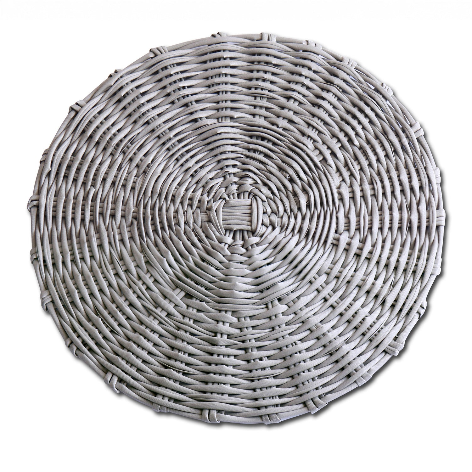 Woven in the style of wicker but made of 100% recycled materials our faux wicker placemats come in four basic color ways. These easy-care, wipe-off round placemats bring a look of natural texture to the table. Use them as table protectors for your dinnerware or to layer with linens for a richly put-together look. Generously sized and easy to clean, the mats are made of recycled materials and make a practical and beautiful addition to your table.