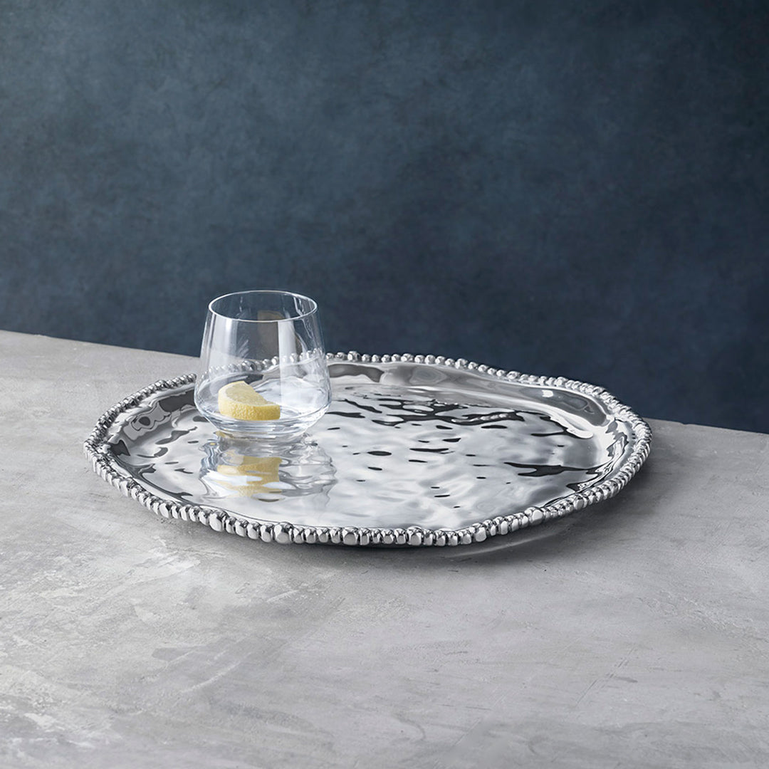 Free-form, fluid lines, and undulating surface are punctuated with a border of shimmering metal pearls, highlighting the handmade craftsmanship of the ORGANIC PEARL Nova Round Platter.
