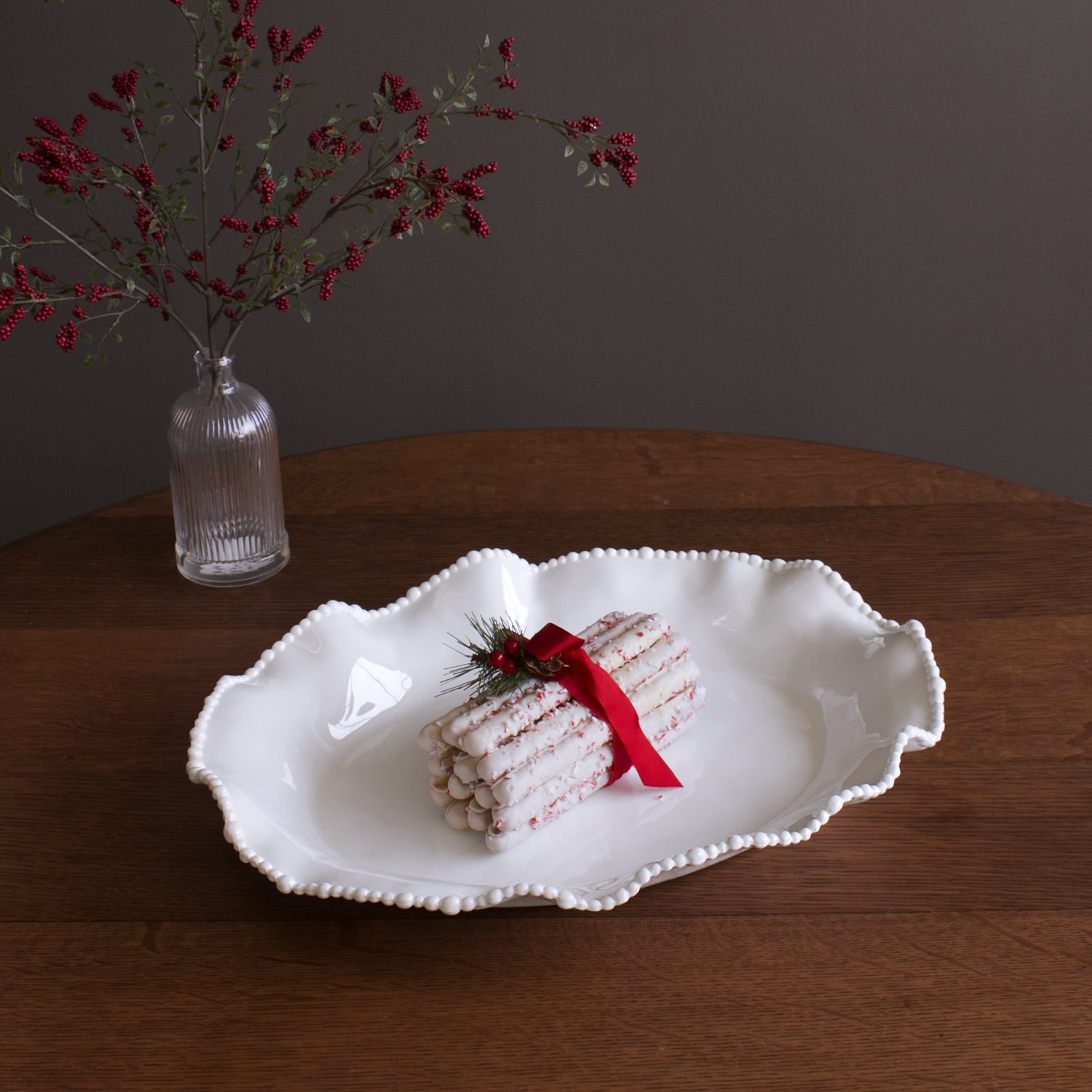 Melamine, reinvented. In signature Beatriz Ball style, the ample VIDA Alegria Oval Platter (White) is an essential item from the bestselling Alegria Collection of luxury melamine. With a charming pearl rim and a brilliant surface, the generous oval tray may be paired with other Alegria pieces for a vibrant table setting. It looks great when sharing a table with items from Beatriz Ball’s signature metal line, too. Perfect for serving cheeses, sushi, charcuterie or desserts, this generous platter has the luster, heft and look of a ceramic piece. Made of luxury melamine for everyday enjoyment, this piece is ideally suited for indoor and outdoor entertainment. Dishwasher safe (top rack), heavy-weight, food safe, BPA and PABA free.