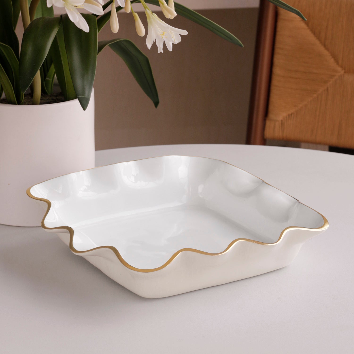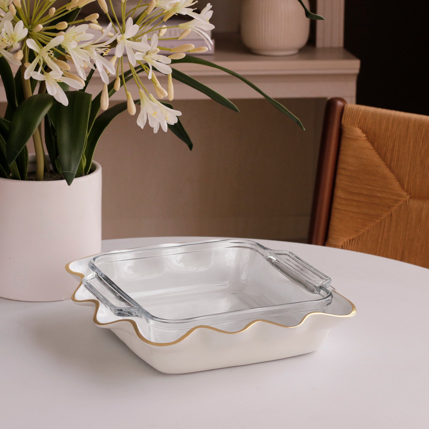 Something new for a thoroughly modern way to entertain. With its flirty curves and brilliant two-tone finish rimmed in gold, the ENCANTO Carola Square Casserole Holder (Cream and White) is a fabulous design that is as practical as it is attractive. Cream, a timeless neutral associated with luxury and elegance, brings a calm sophistication that enhances any table setting.