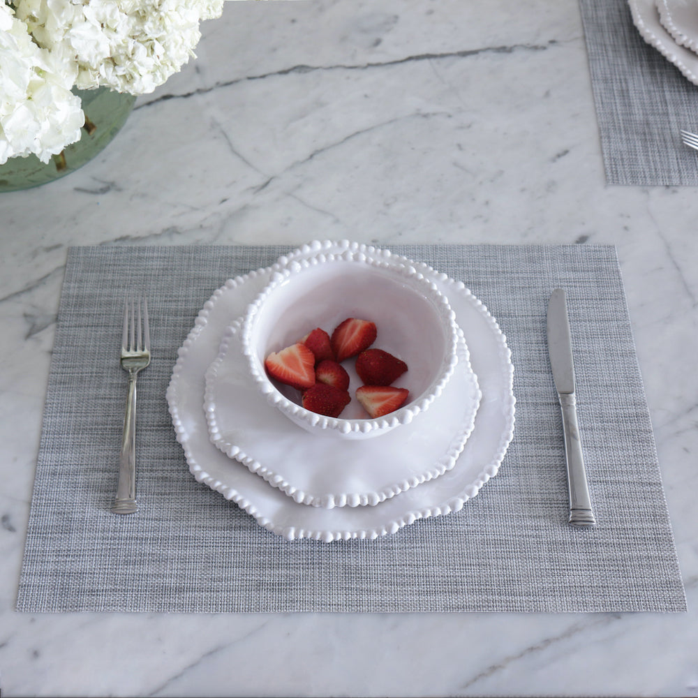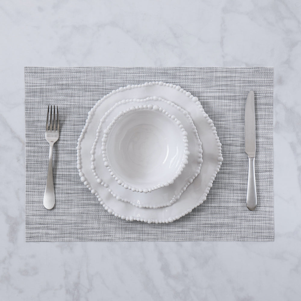 A dynamic grey! Beatriz Ball's VIDA Rectangular Woven Placemat Set of 4 (Grey) will give any table a sophisticated makeover with its understated blend of color, pattern, and texture. Sold in sets of four, this eye-catching design in a grey has the look of a handloomed piece, but with the durability and carefree quality you'll love. Generously sized for a handsome look on your table--indoors or out. Pair them with our Easy Peasy napkins for a great addition. Easy care, wash with soap and water. Made of eco-friendly, high quality, environmentally safe PVC. Phthalate free.