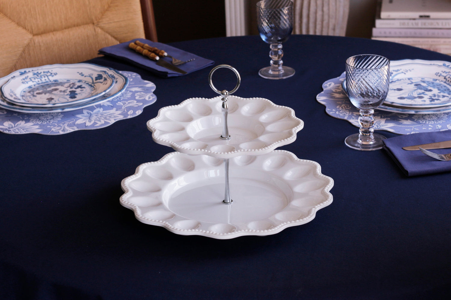 By popular demand, the VIDA Alegria Two-Tiered Egg Server (White) combines elegance and function in signature Beatriz Ball style. With charming pearl rims and brilliant white surfaces, its two graduated tiers are joined by silver-toned risers topped with a circular handle.