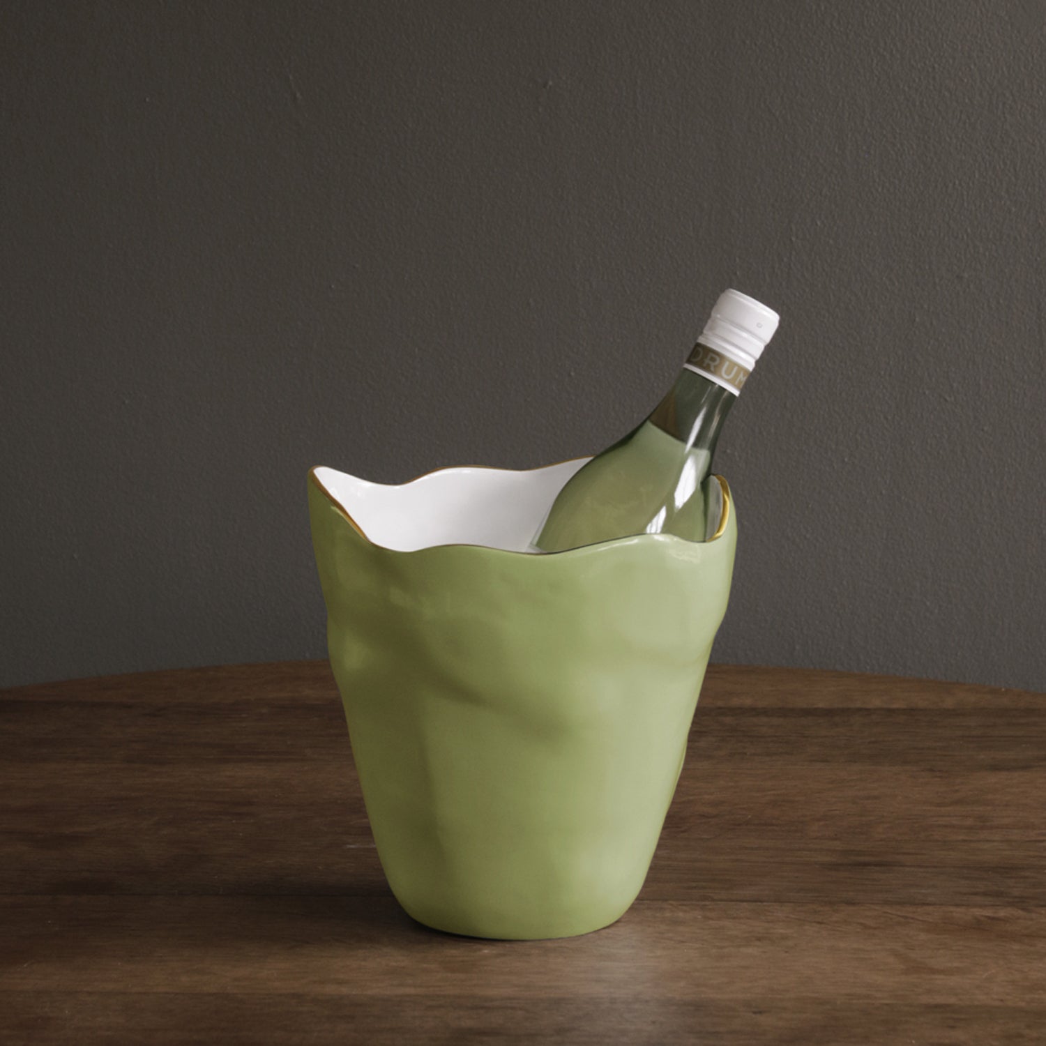 An essential ice bucket. The striking sculptural form of Beatriz Ball's ENCANTO Soho Large Ice Bucket (Green and Cream) is a perfect match for the lifestyle demands of today. Notable for its irregular form, and brilliant green and cream finish rimmed in gold, the ENCANTO Soho Large Ice Bucket (Green and Cream) is an awesome design that is as practical as it is decorative. Ideal for serving ice or chilling wine. Combine with other ENCANTO pieces for a sensational set. Fabulous gift items for brides, and perfect for anyone who loves to entertain. Beatriz Ball’s intensely handmade products use eco-friendly and sustainable materials and are crafted by artisans who trace a heritage of metalworking for generations. Made of a top quality, easy-care, aluminum alloy with an enamel finish. Dishwasher safe.