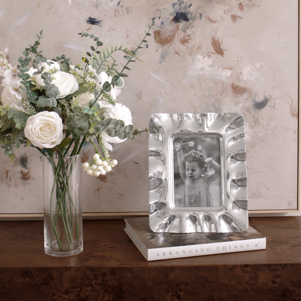Enduring artisanship. The Beatriz Ball FRAME Vento 5 x 7 decorative frame shows off your favorite photo in shimmering, sophisticated, hand-polished surroundings. Can be displayed vertically or horizontally. Sophisticated styling and superior craftsmanship makes this a perfect gift for someone special. Made of an FDA safe, easy-care, oven and freezer friendly aluminum alloy. Tarnish free.