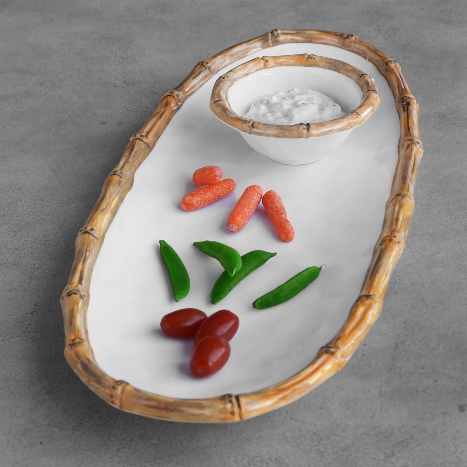 Smaller than our "small" dip bowl; presenting a versatile mini dip bowl in classic Bamboo style! The VIDA Bamboo Mini Dip Bowl (White and Natural), an essential serving piece from Beatriz Ball's VIDA Collection of luxury melamine, is the result of a collaboration between the award-wining tabletop company and noted illustrator, August Wren. With a bamboo inspired rim and a brilliant white surface, the bowl works well with our VIDA Bamboo dining sets, serving pieces and flatware. Pair with any of our larger Bamboo platters or bowls for a great chip and dip set. Create a table with a carefree and classy Beatriz Ball twist! It looks great when sharing a table with GARDEN Bamboo items from our signature metal line too. Perfect for a variety of serving needs, the mini dip bowl has the luster, heft and look of a ceramic piece. Made of luxury melamine for everyday enjoyment, this piece is ideally suited for indoor and outdoor entertainment. Dishwasher safe (top rack), heavy weight, food safe, BPA and PABA free.